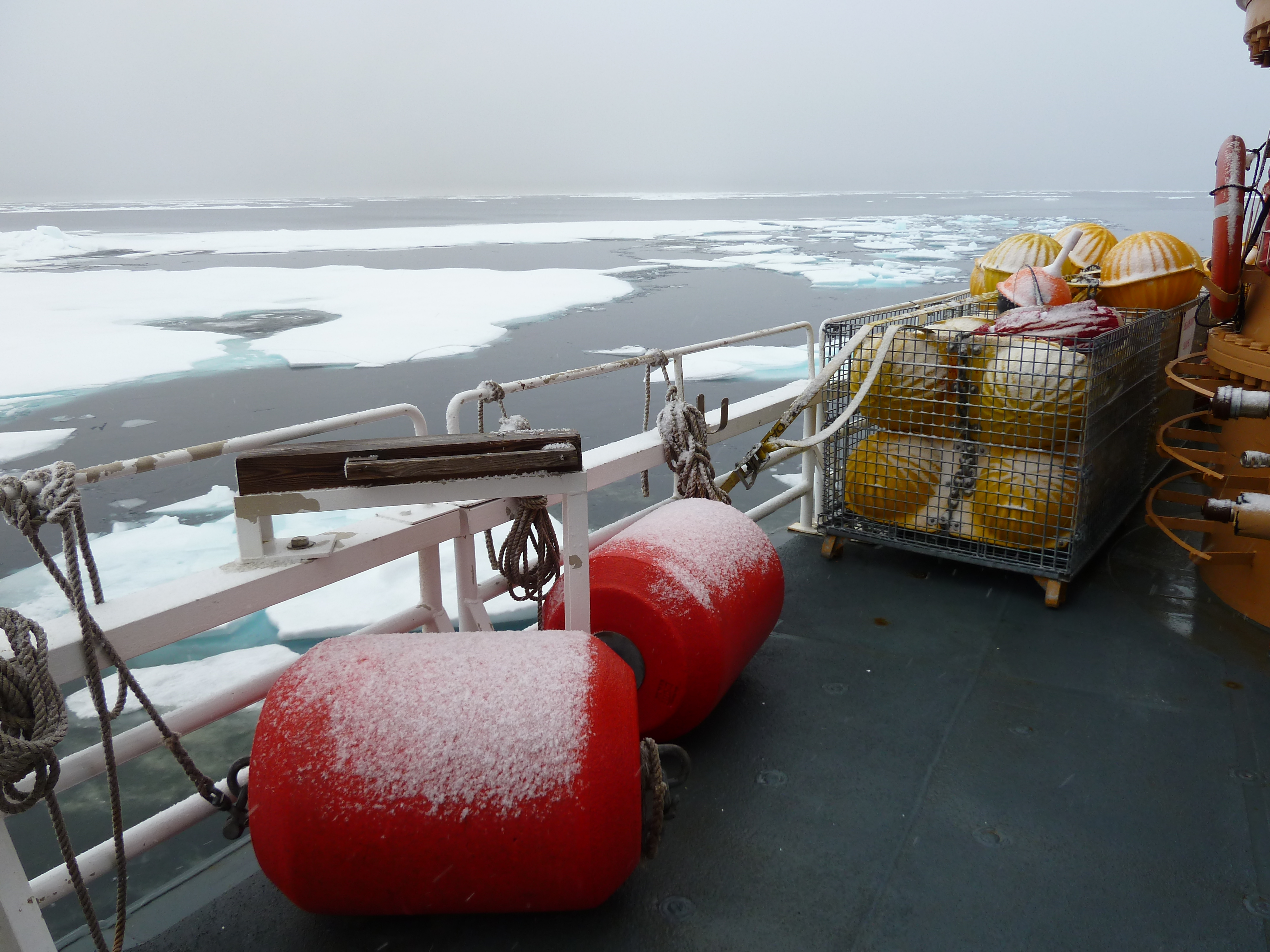 Fresh snow dusts the fenders (big red cylinders) and mooring 'hard hats' (yellow spheres). Aboard the USCGC Healy icebreaker in the Arctic Ocean.