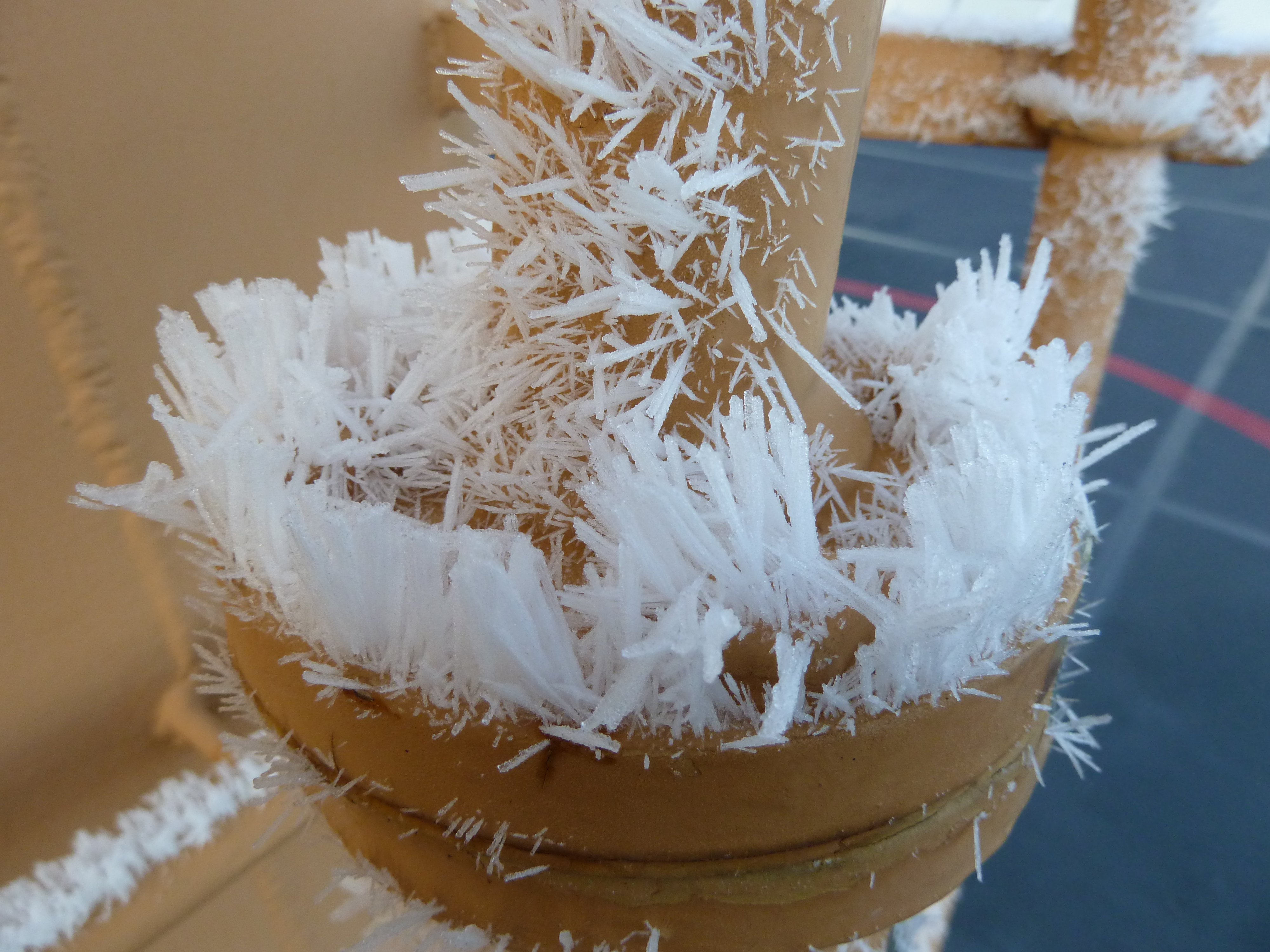 Hoar frost crystals, over an inch long, growing on a railing aboard the USCGC Healy icebreaker in the Arctic Ocean.