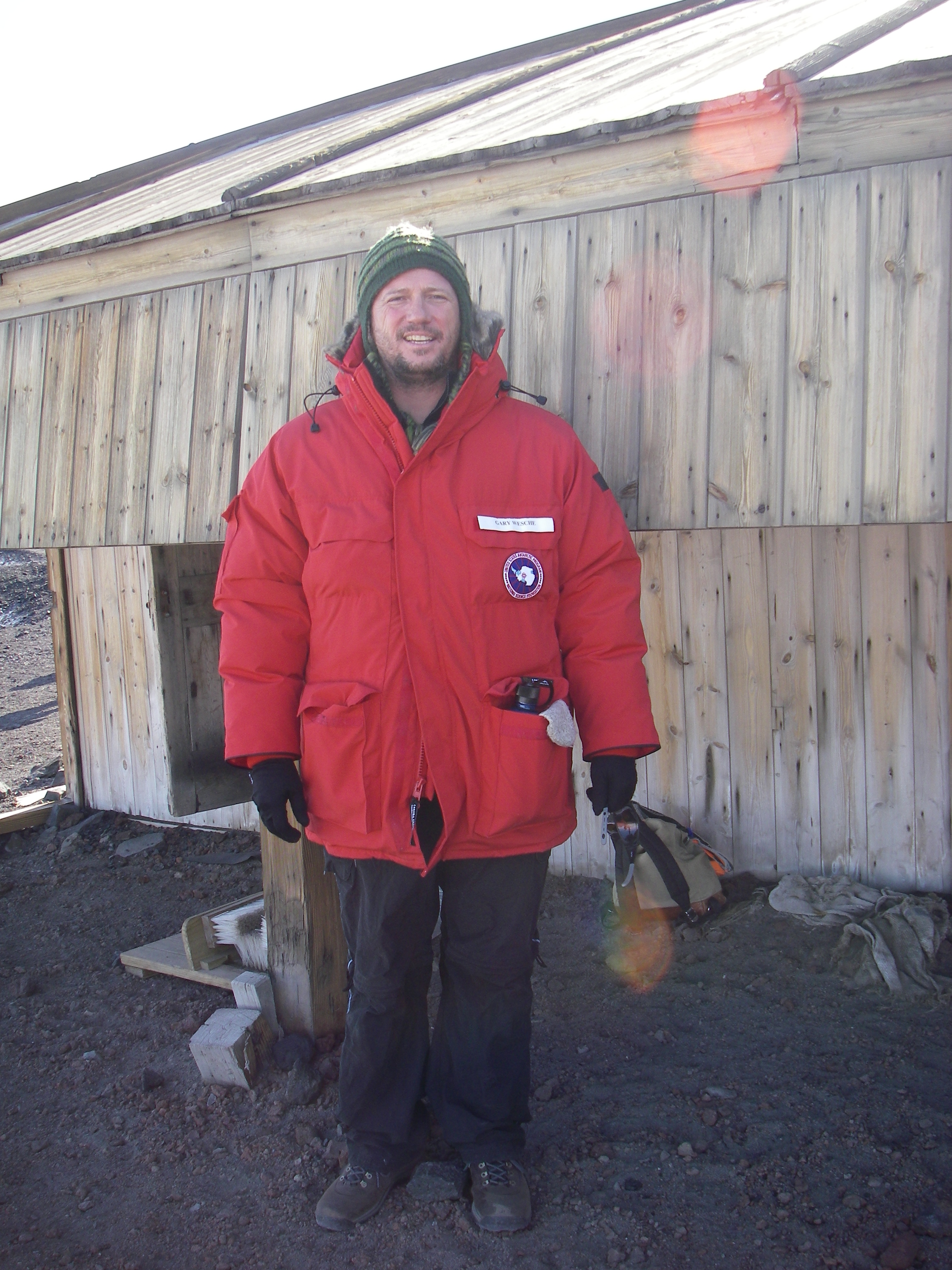 Gary Wesche poses in front of the Discovery Hut at Hut's Point, near McMurdo Station, Antarctica.