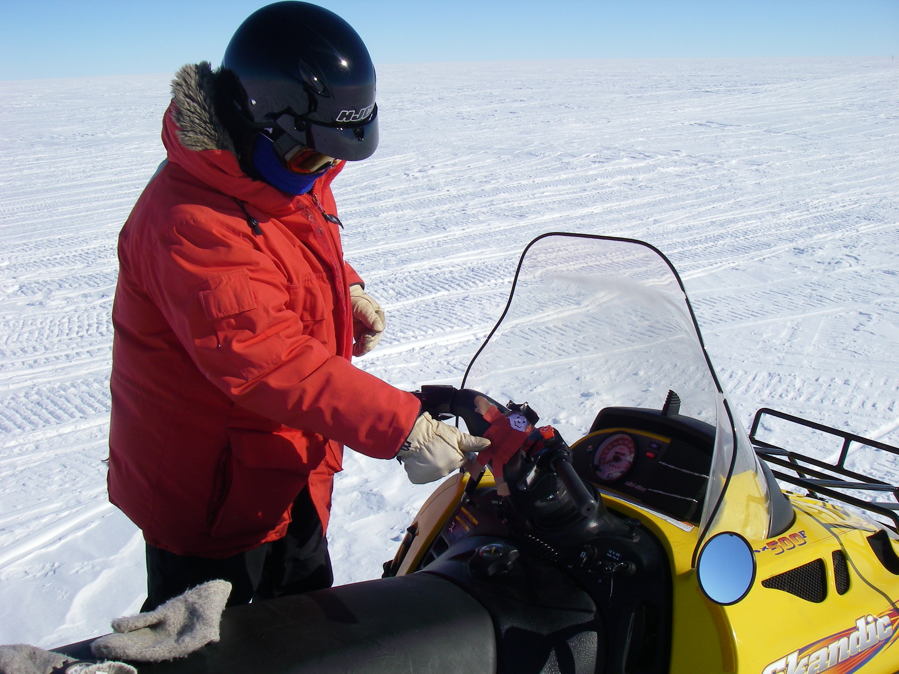 Gary Wesche: "Logan and Flat Stanley wear their helmets and are ready to ride." Byrd Surface Camp, Antarctica.