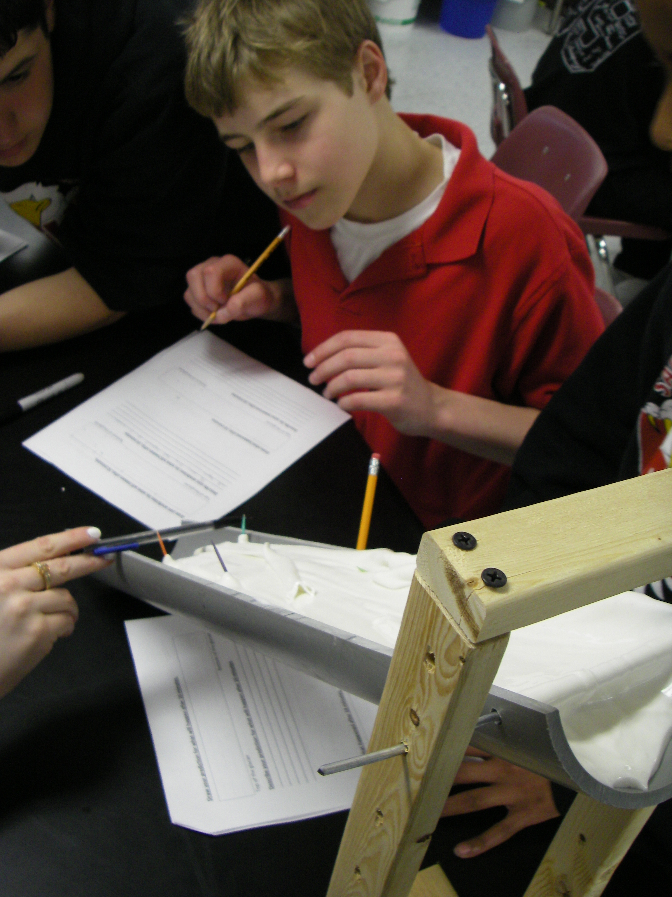 Ben, a student at St. Regis school, watches his simulated glacier for movement. St. Regis School in Kansas City, Missouri.