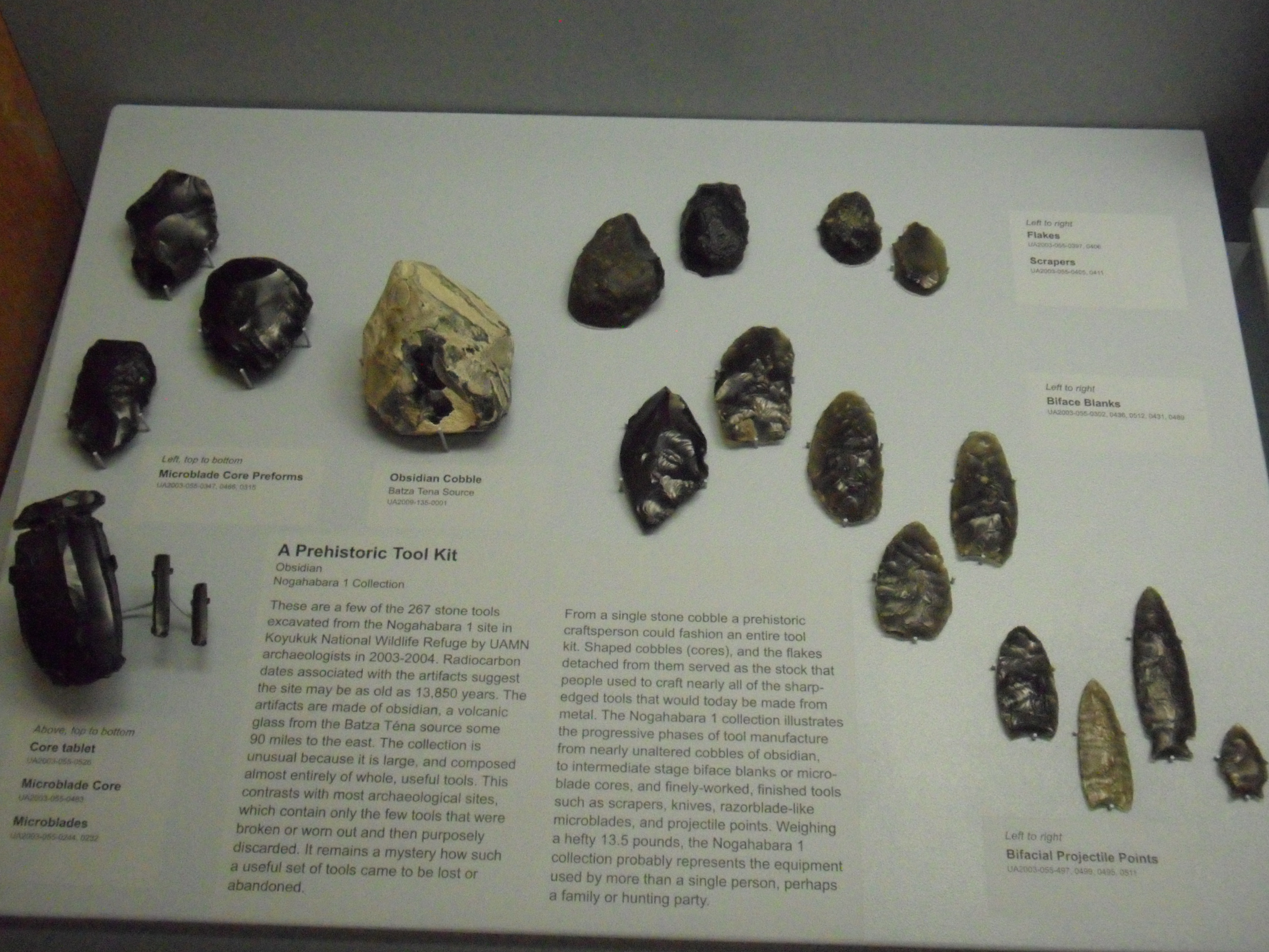 A collection of ancient handmade obsidian tools on display at the University of Alaska Fairbanks' Museum of the North. Researchers think these tools may be upwards of 13,000 years old. University of Alaska, Fairbanks, Museum of the North.