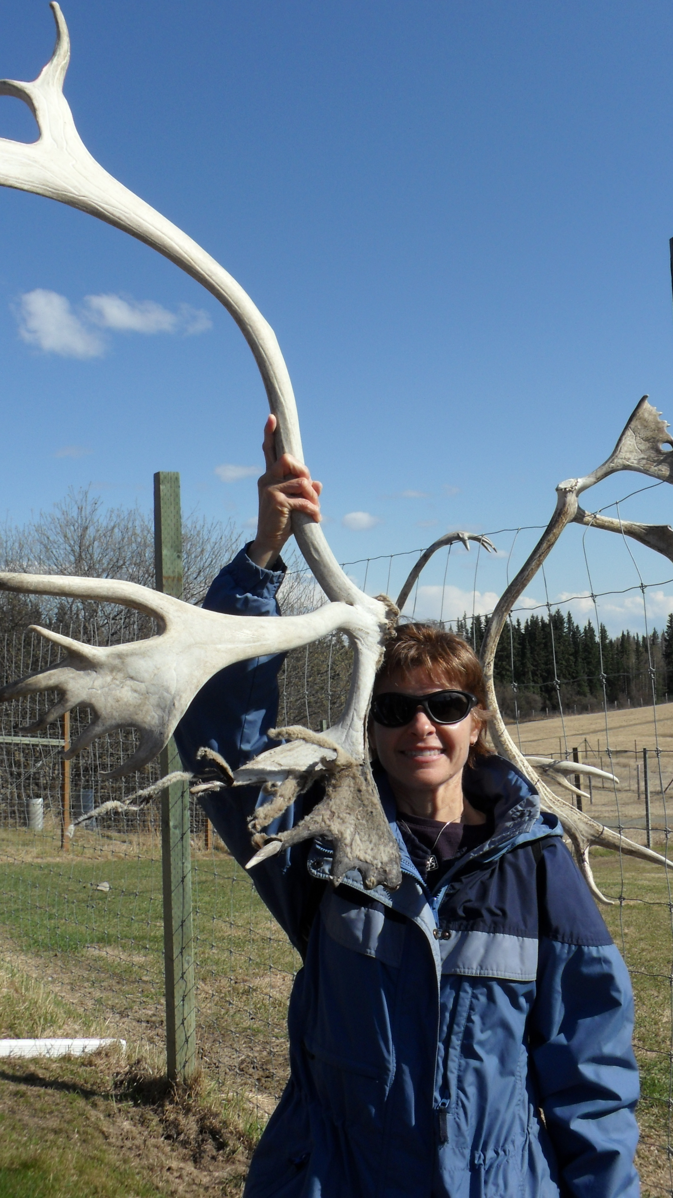 Claude Larson holds caribou antlers at the Robert G. White Large Animal Research Station in Fairbanks, Alaska.
