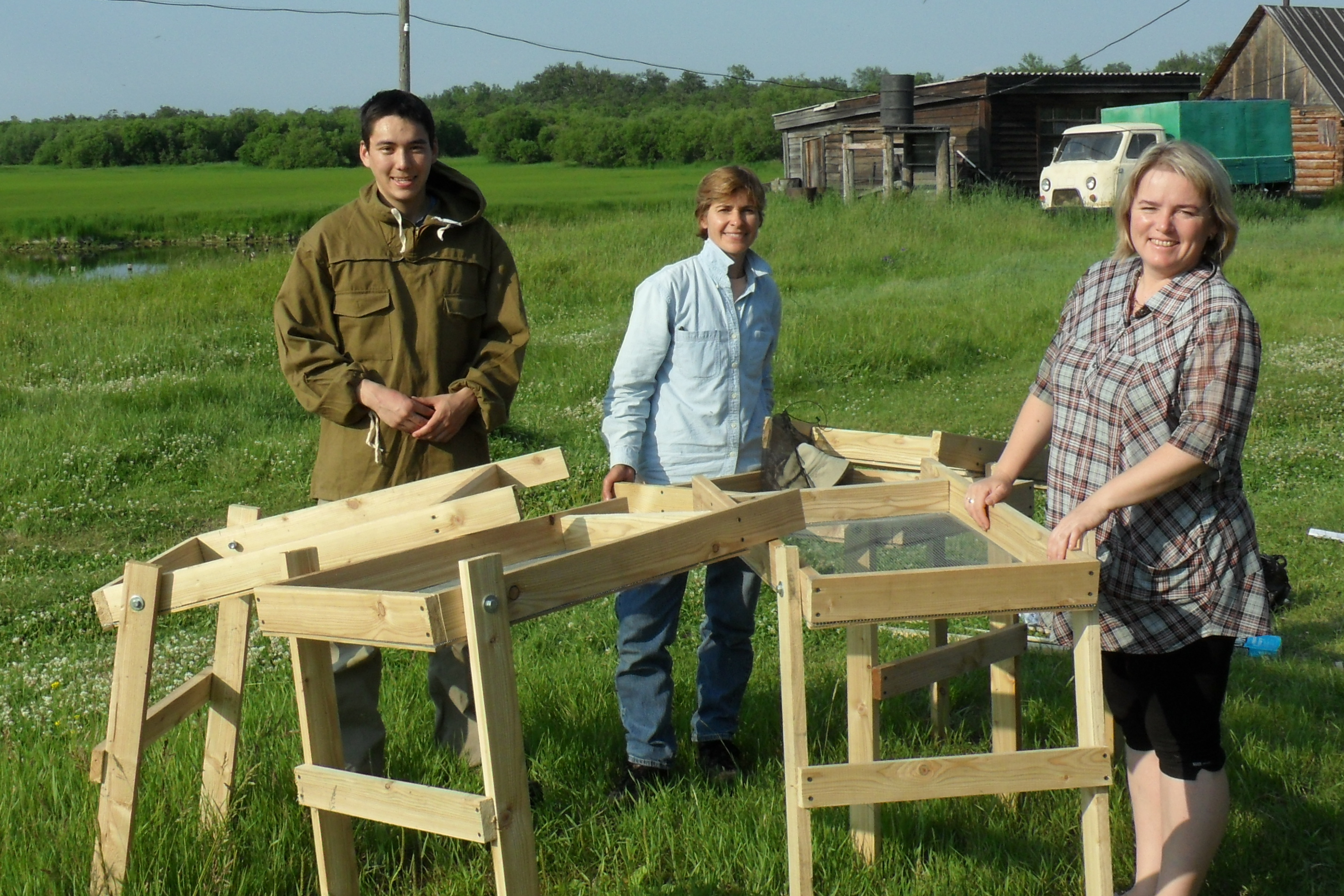 Sean-Paul Le Selle, Claude Larson, and Irina pose with the newly completed sifting screens. Ushki Lake, Russia.