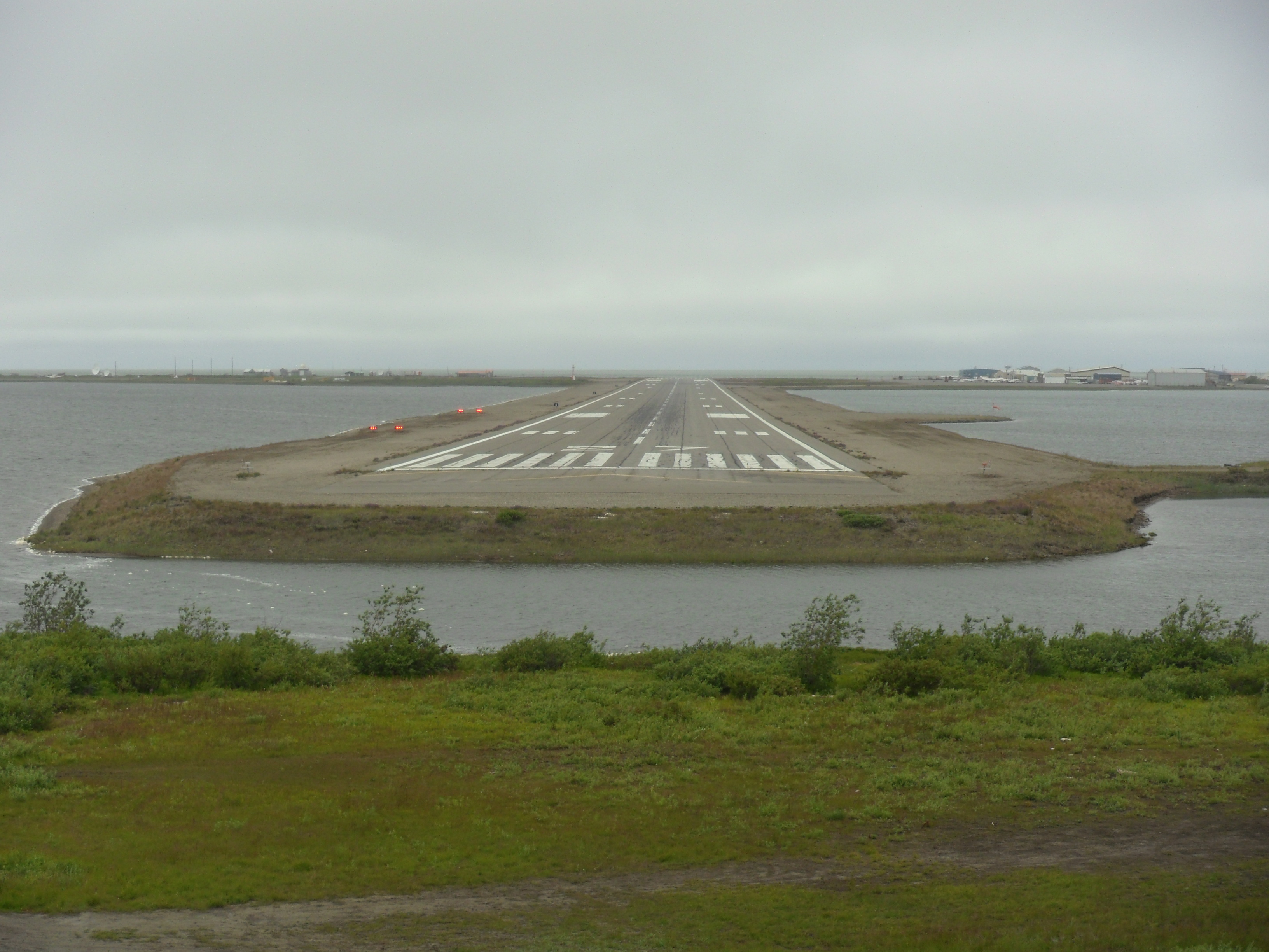 This is a view looking right down the runway as if landing at the airport in Kotzebue. This shot was taken from the bluff above town to the east. Kotzebue, Alaska.