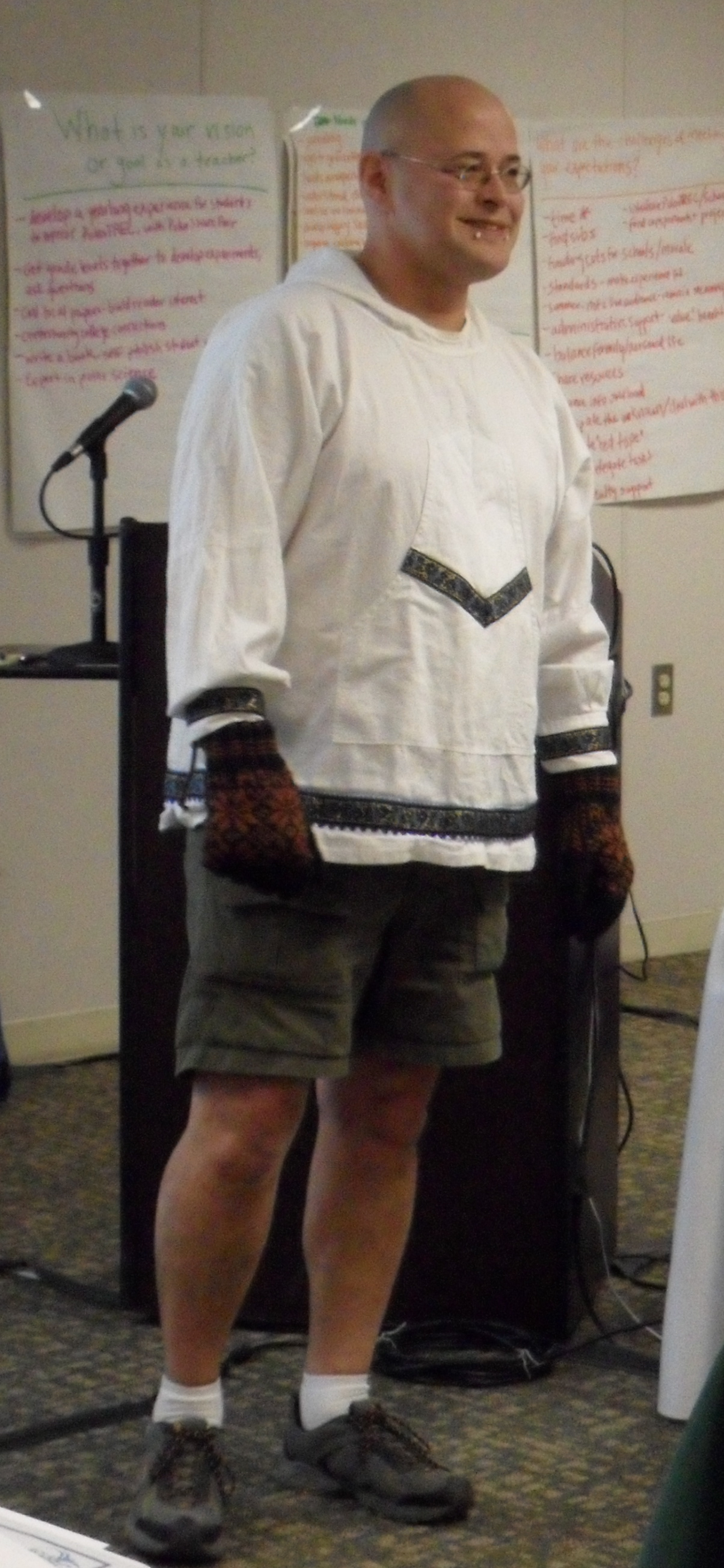 Sean Topkok speaks to the PolarTREC group and prepares the PolarTREC teachers for the igloo dance lesson. Fairbanks, Alaska.