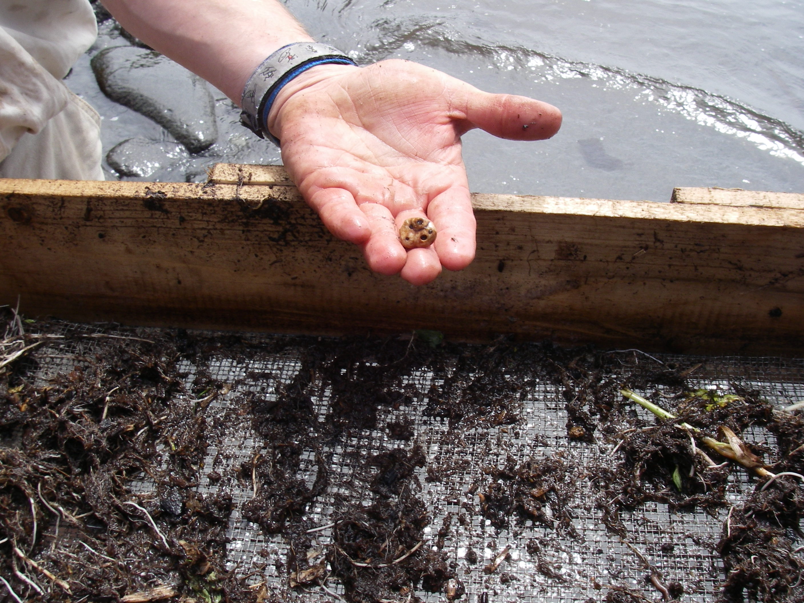 Mike Etnier holds out a sea otter tooth retrieved from the wet screening of midden material at Kapsyul Bay, Russia.