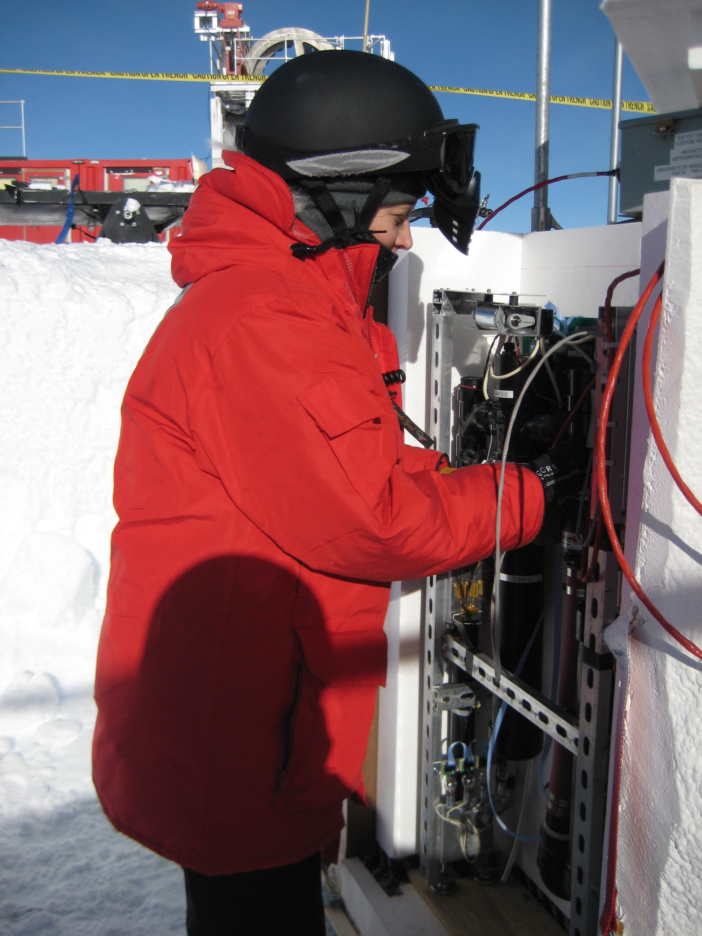 Katey Shirey helps install the last FCU (Freeze Control Unit) for the IceCube project. Amundsen–Scott South Pole Station, Antarctica.