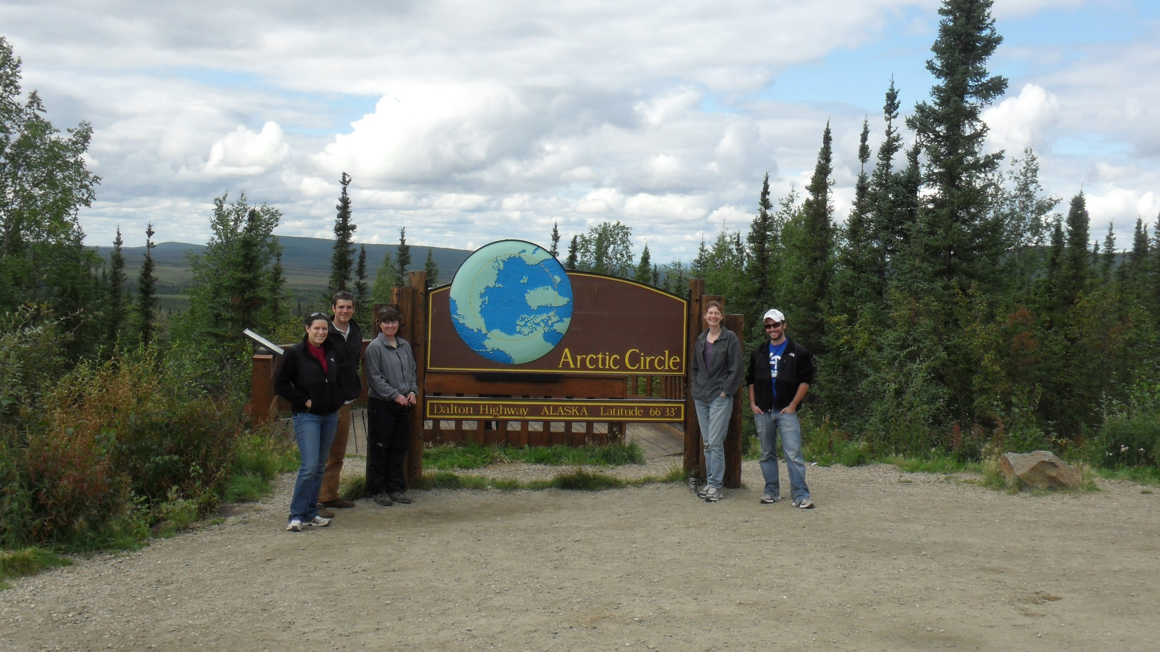 From left to right: Kelsey, Josh Dugat, Dr. Cathy Sebold, Dr. Anna Klene, and Elliot stop before crossing the Arctic Circle on the drive to Prudhoe Bay. Dalton Highway, Alaska.