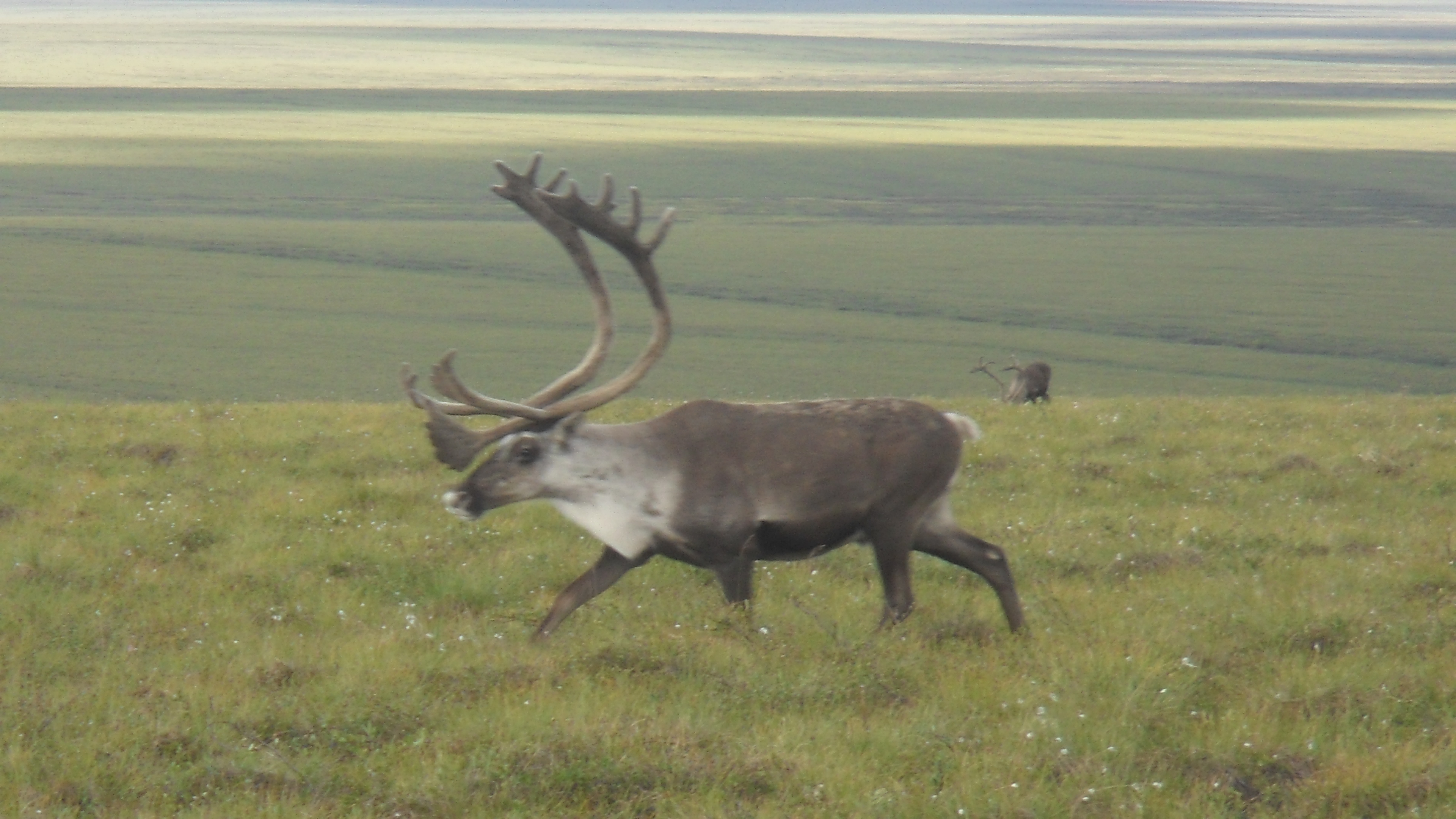 A male caribou walks in the foreground with several females in the background. Toolik Field Station, Alaska.