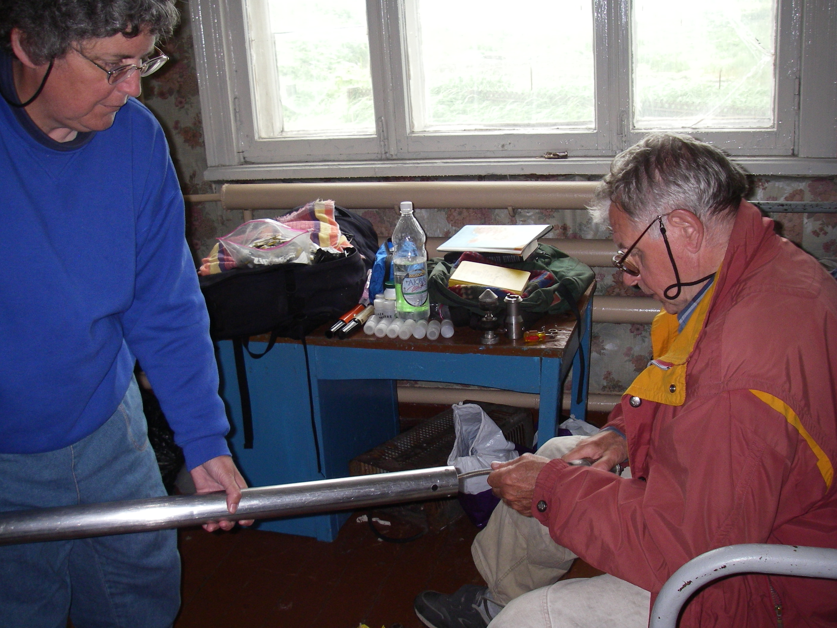 Pat Anderson (L) and Anatoly Lozhkin (R) putting together the Livingston Corer, which is used to take lake sediment core samples.