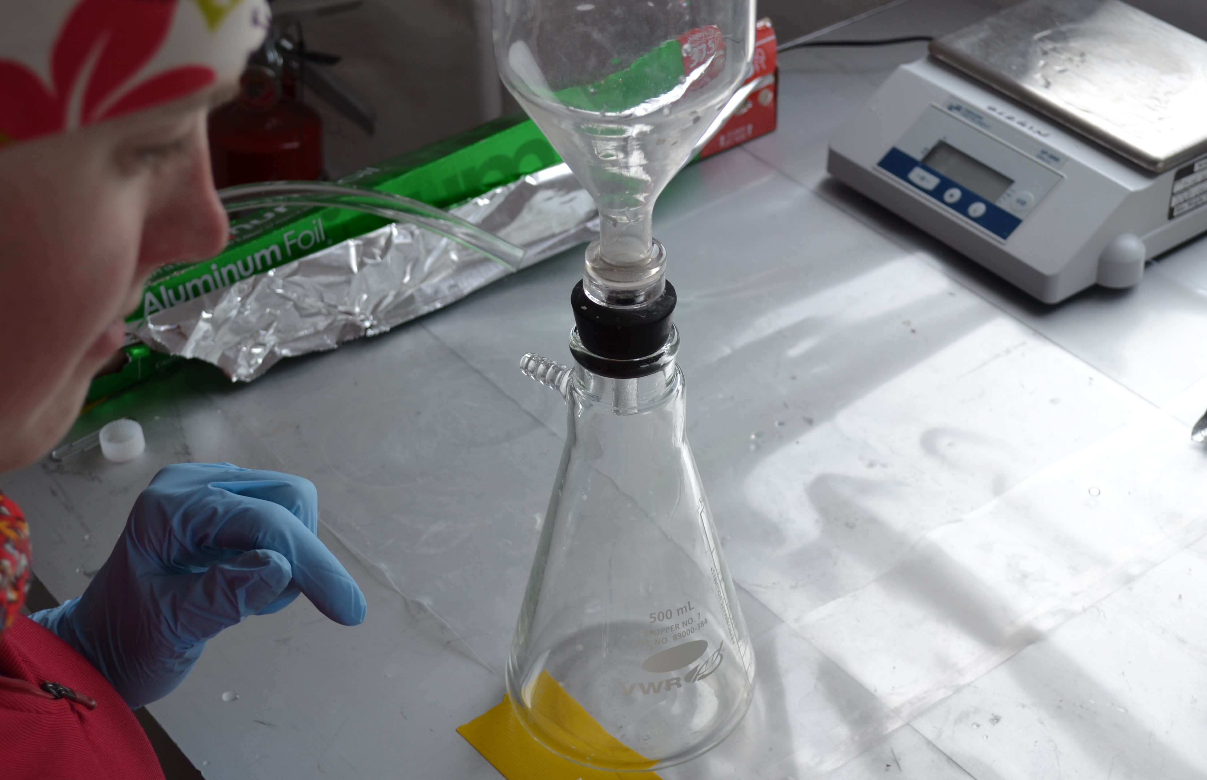 Hannah James filters melted snow from the Greenland Ice Sheet. Summit Station, Greenland.