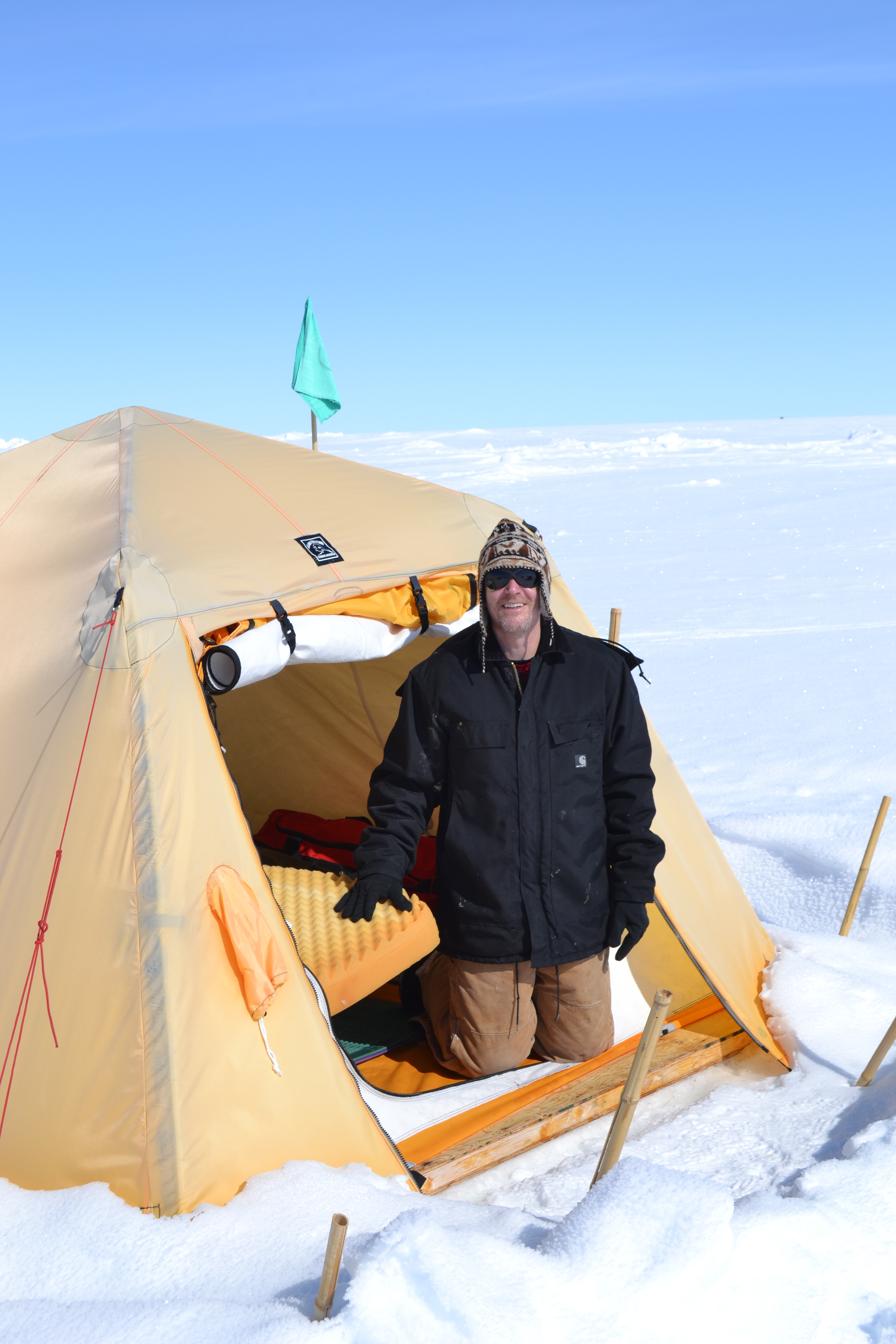 Kevin McMahon poses inside his Arctic Oven tent. Summit Station, Greenland.