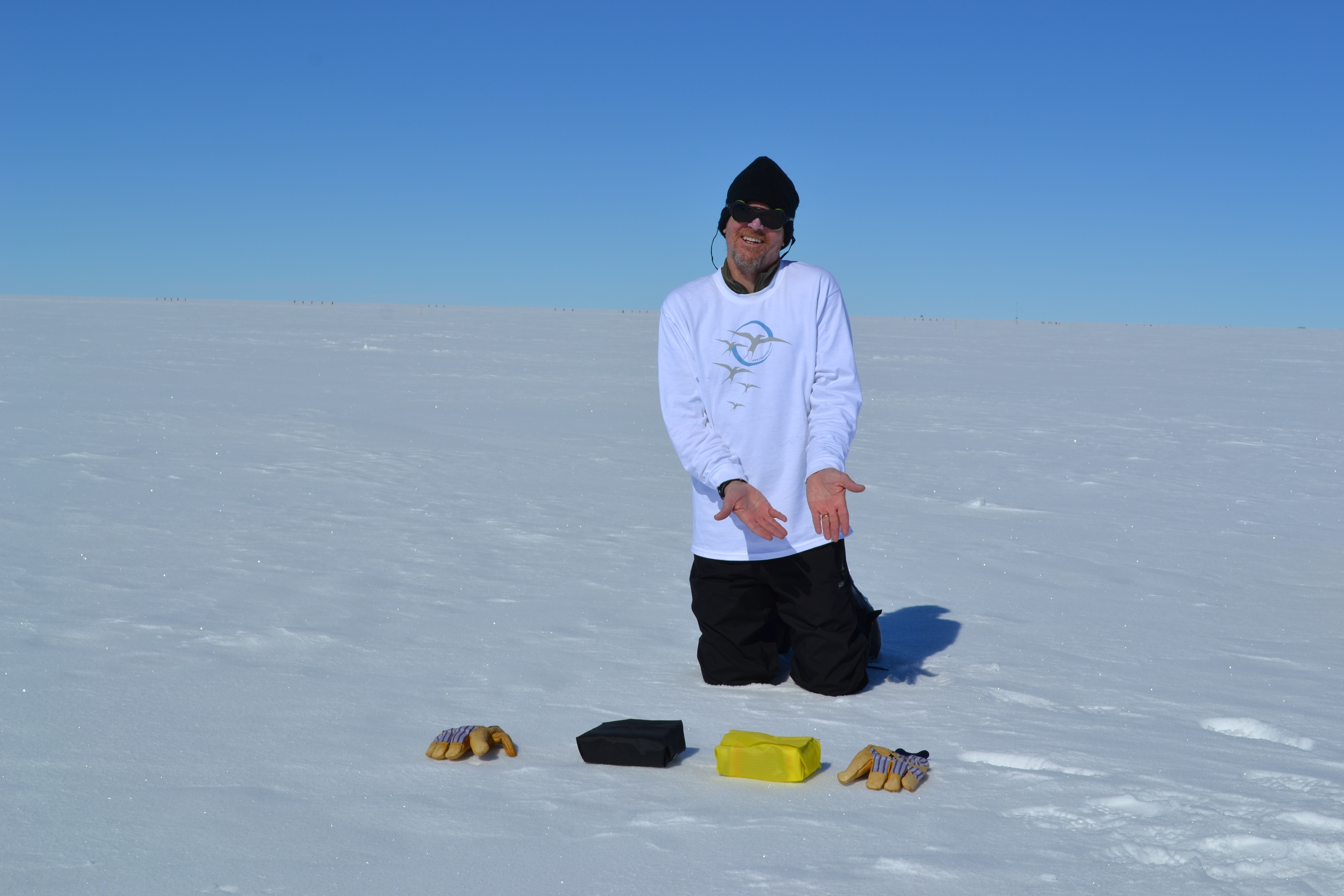 Kevin McMahon poses in front of the 6th grade experiment to determine why tents on the Greenland Ice Sheet are yellow and not black in color. Summit Station, Greenland.