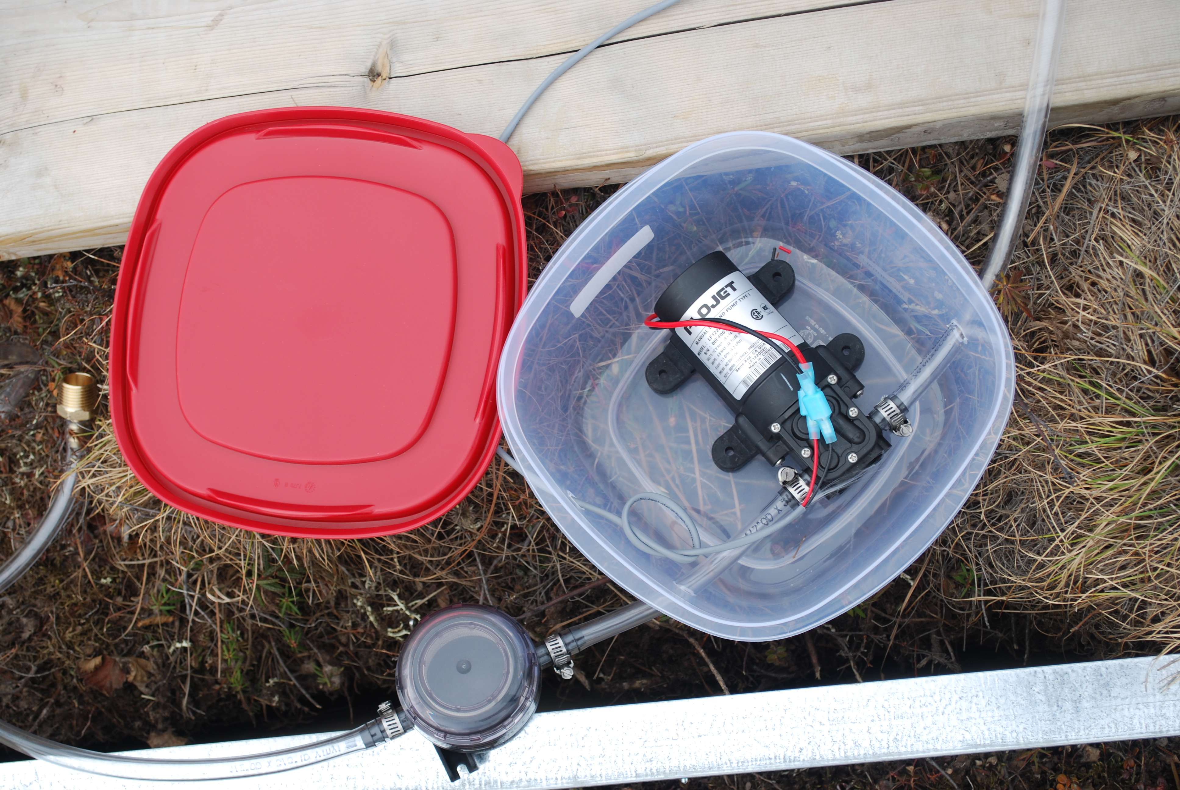 The pump for the drying plot is placed in a plastic container to protect it from the rain. Healy, Alaska.