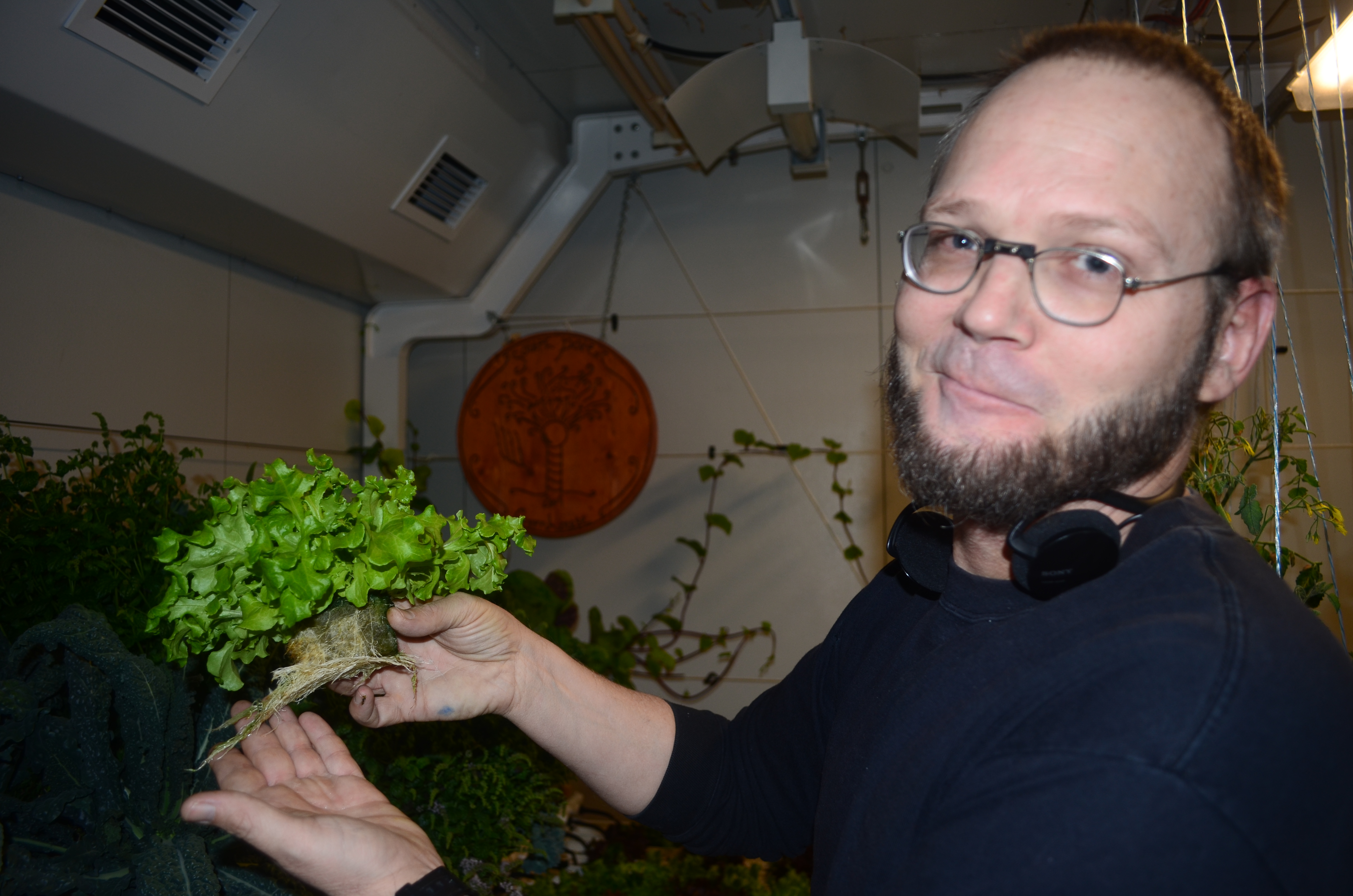 Michelle Brown: "Lane Patterson shows off the soil-free roots of some healthy lettuce." Amundsen–Scott South Pole Station, Antarctica.