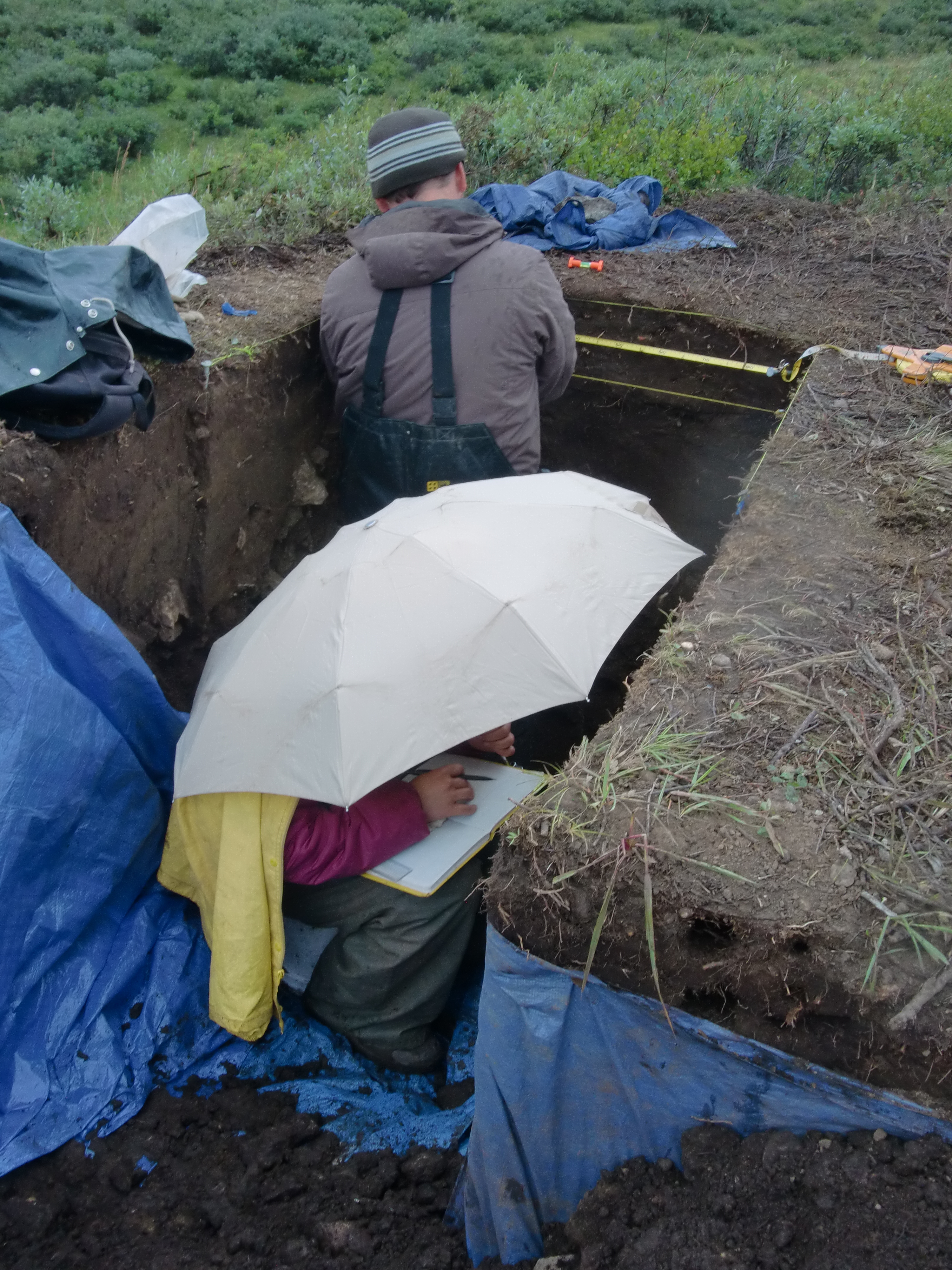 Ian Buvit and Natasha finish the soil profile on the same wall where the horse bone was found, while the team backfills the rest of the site. At Raven Bluff, near Kivalina, Alaska.