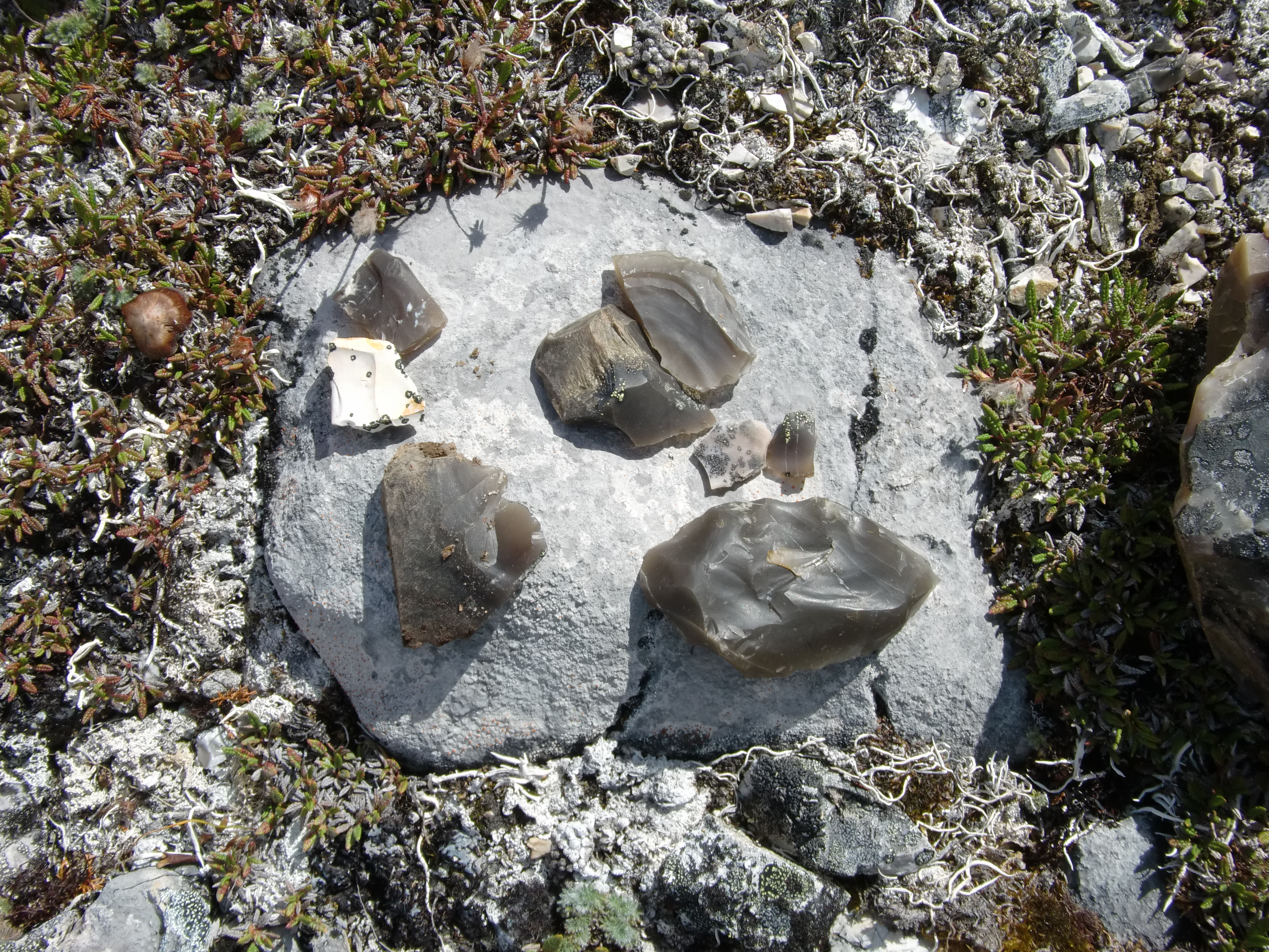 Susy Ellison: "These are some of the chert flakes that we found at one of the sites. The chert was almost translucent." At Raven Bluff, near Kivalina, Alaska.