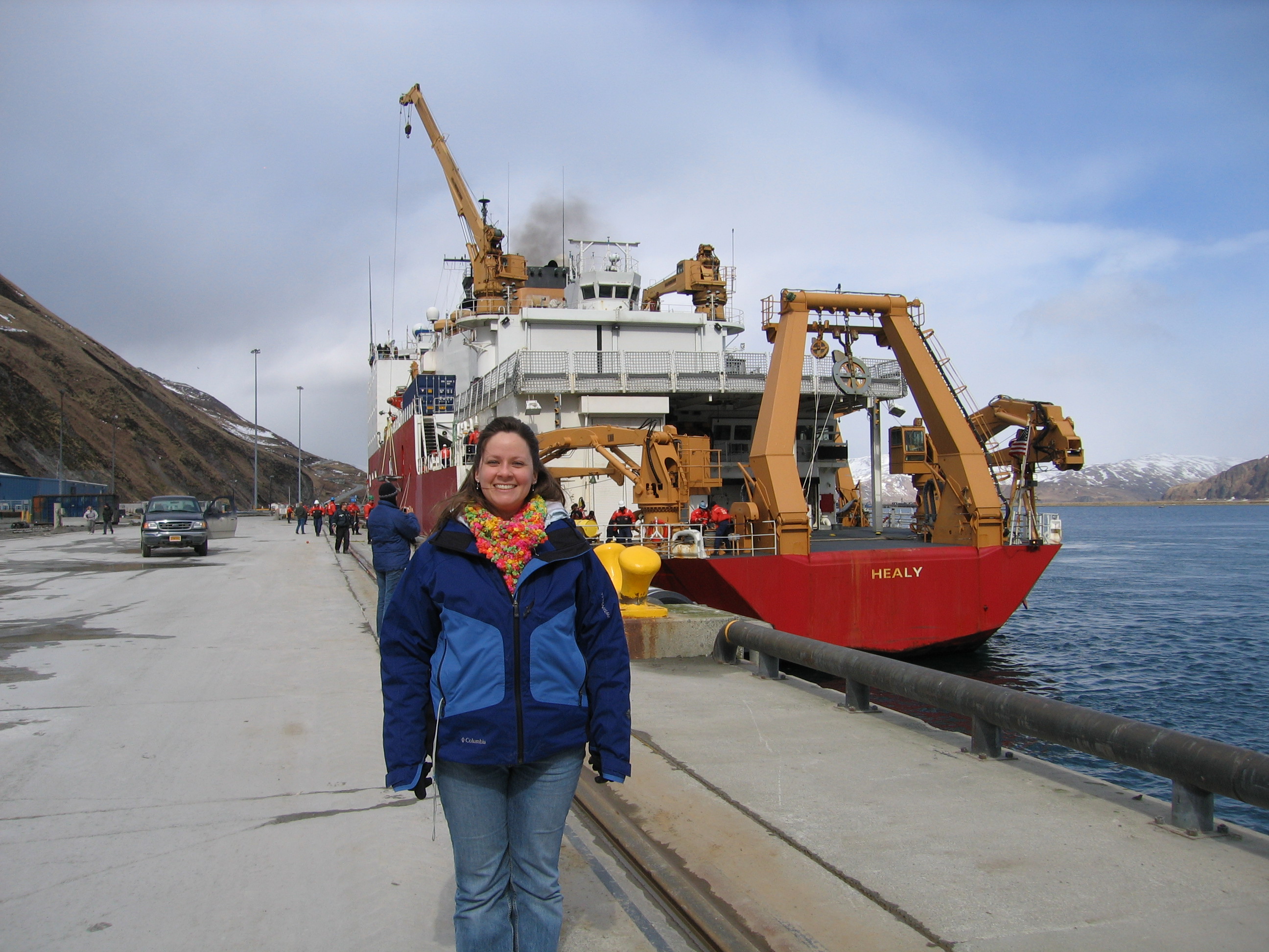 TREC teacher Samantha Barlow in front of USCG Healy icebreaker, Dutch Harbor, AK.