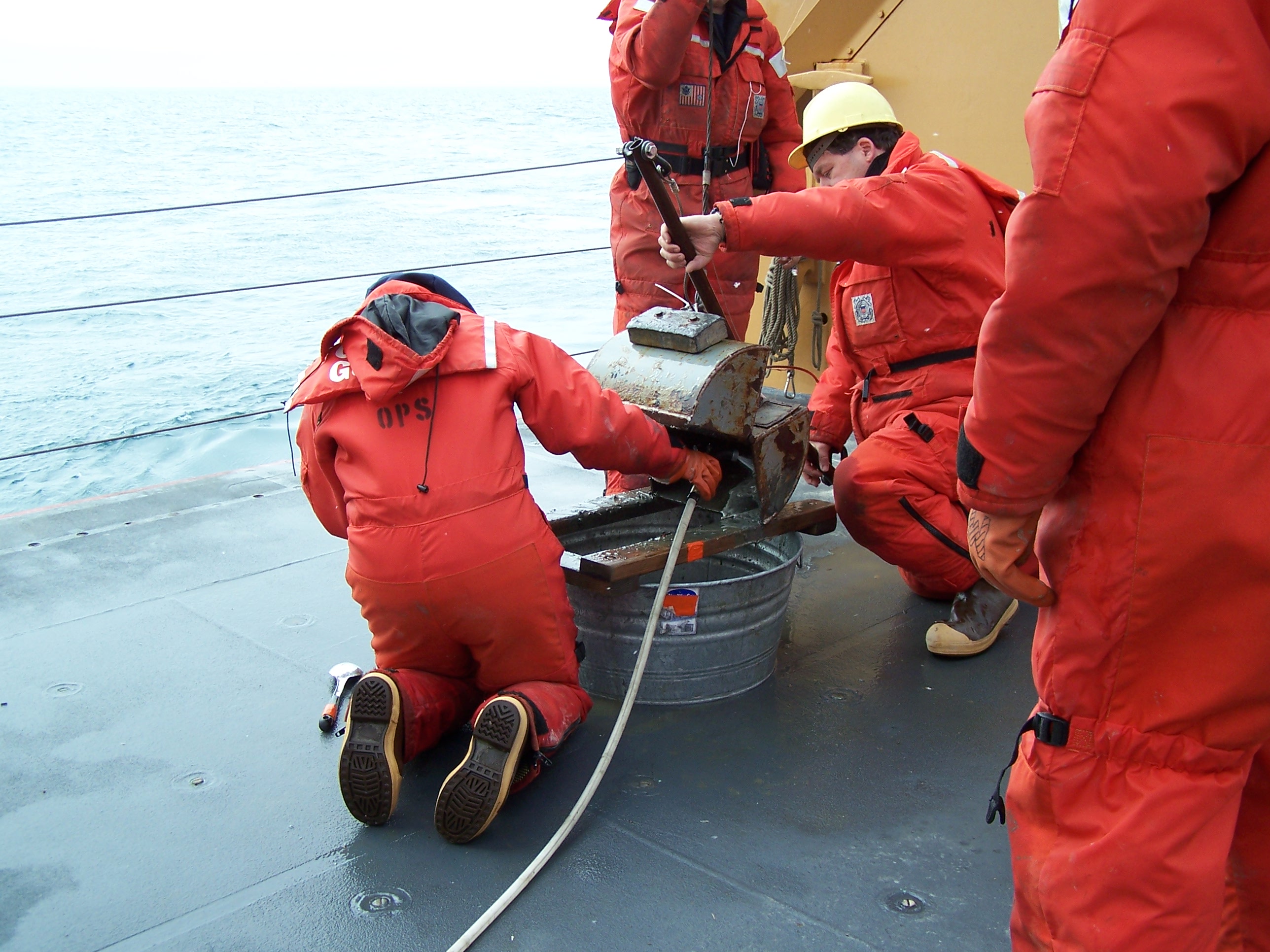 Lee Cooper emptying the vanVeen grab on the USCG Healy icebreaker.