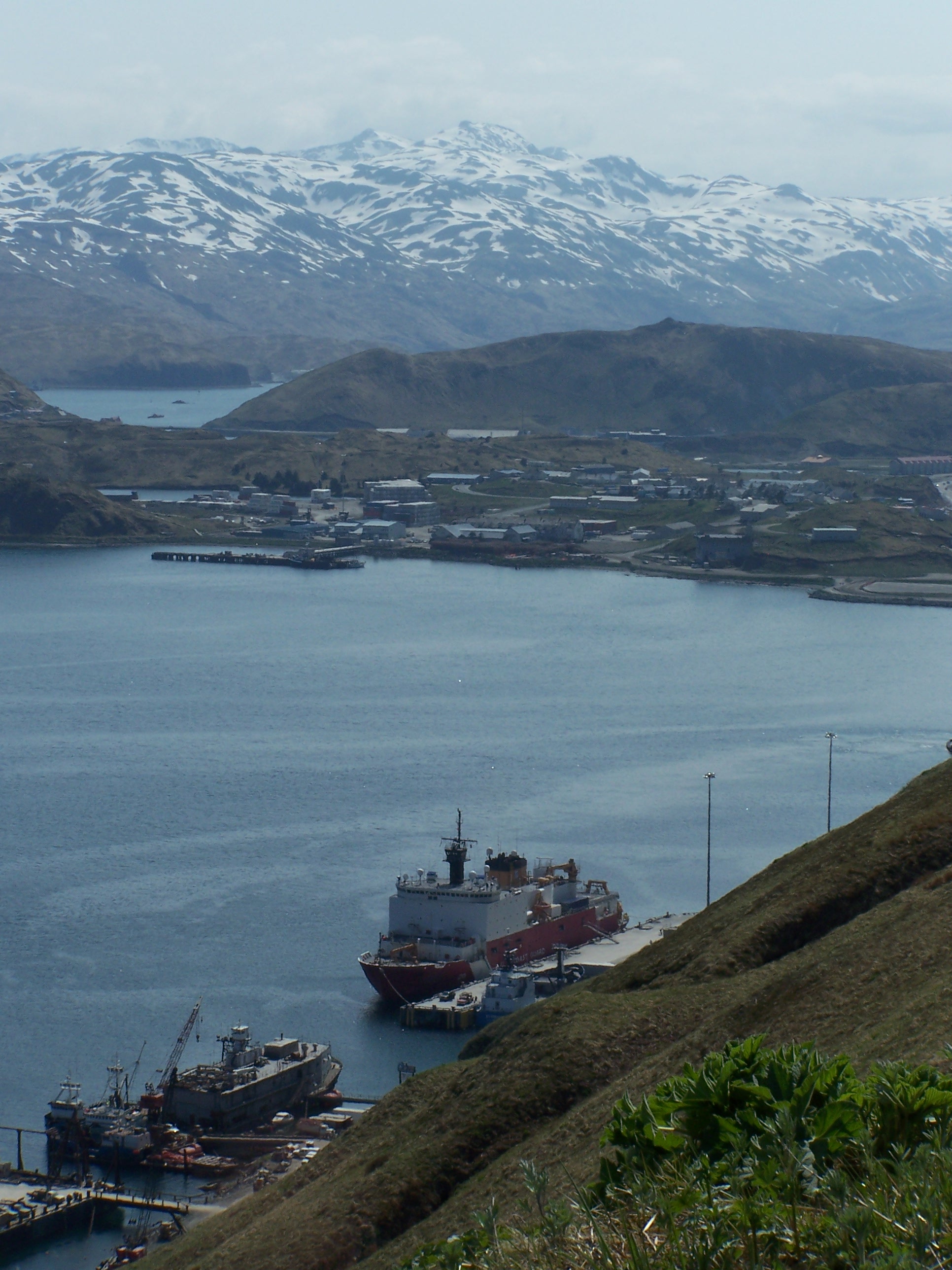 USCGC Healy at dock with mountains of Dutch Harbor, AK in the distance.