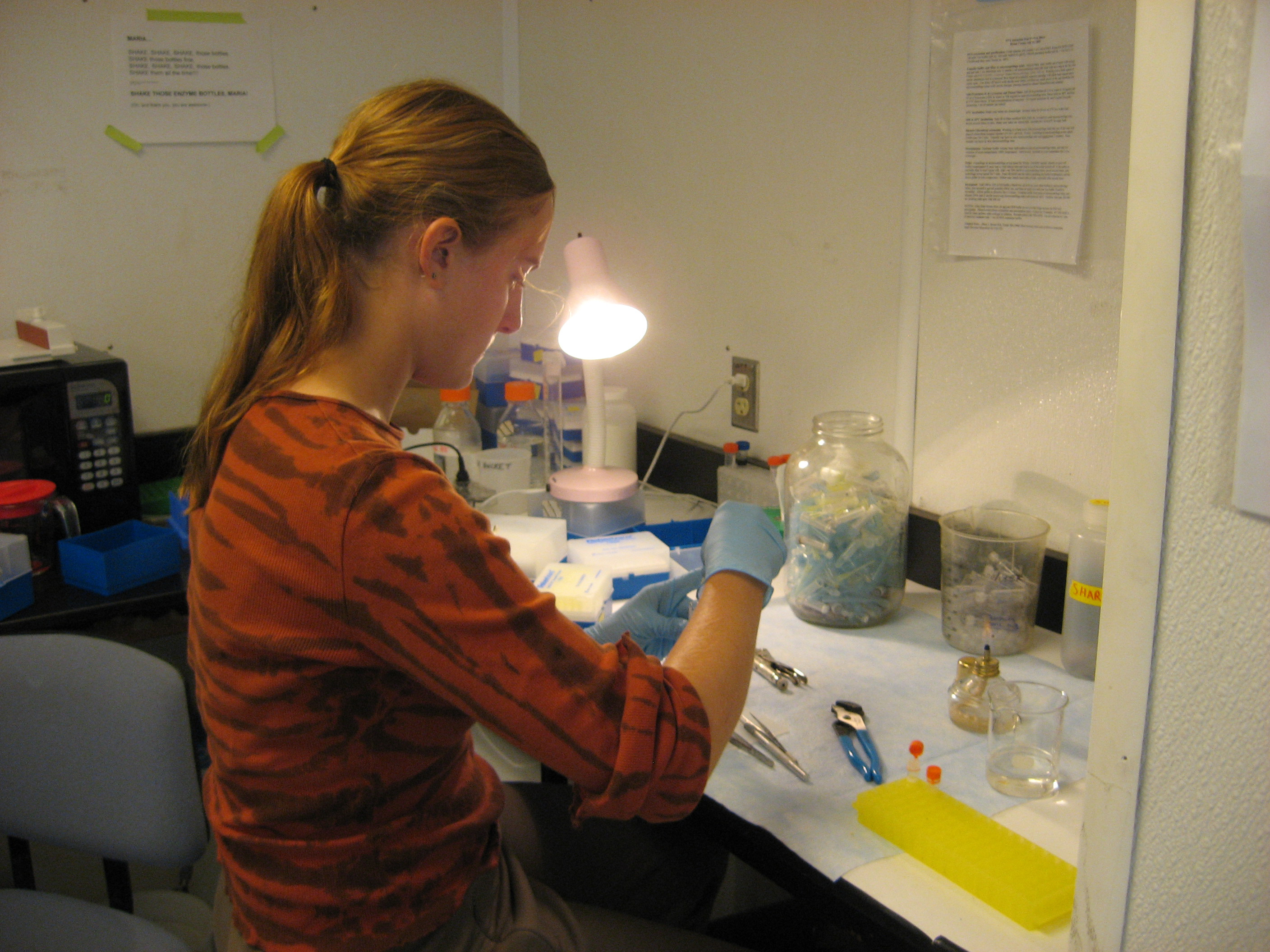 Joanna Green, a research assistant in Byron Crump's lab at the University of Maryland Center for Environmental Science, extracts microbial DNA from water samples taken near Toolik Lake. The project seeks to describe long-term changes in microbial diversity and community dynamics in arctic freshwater ecosystems.