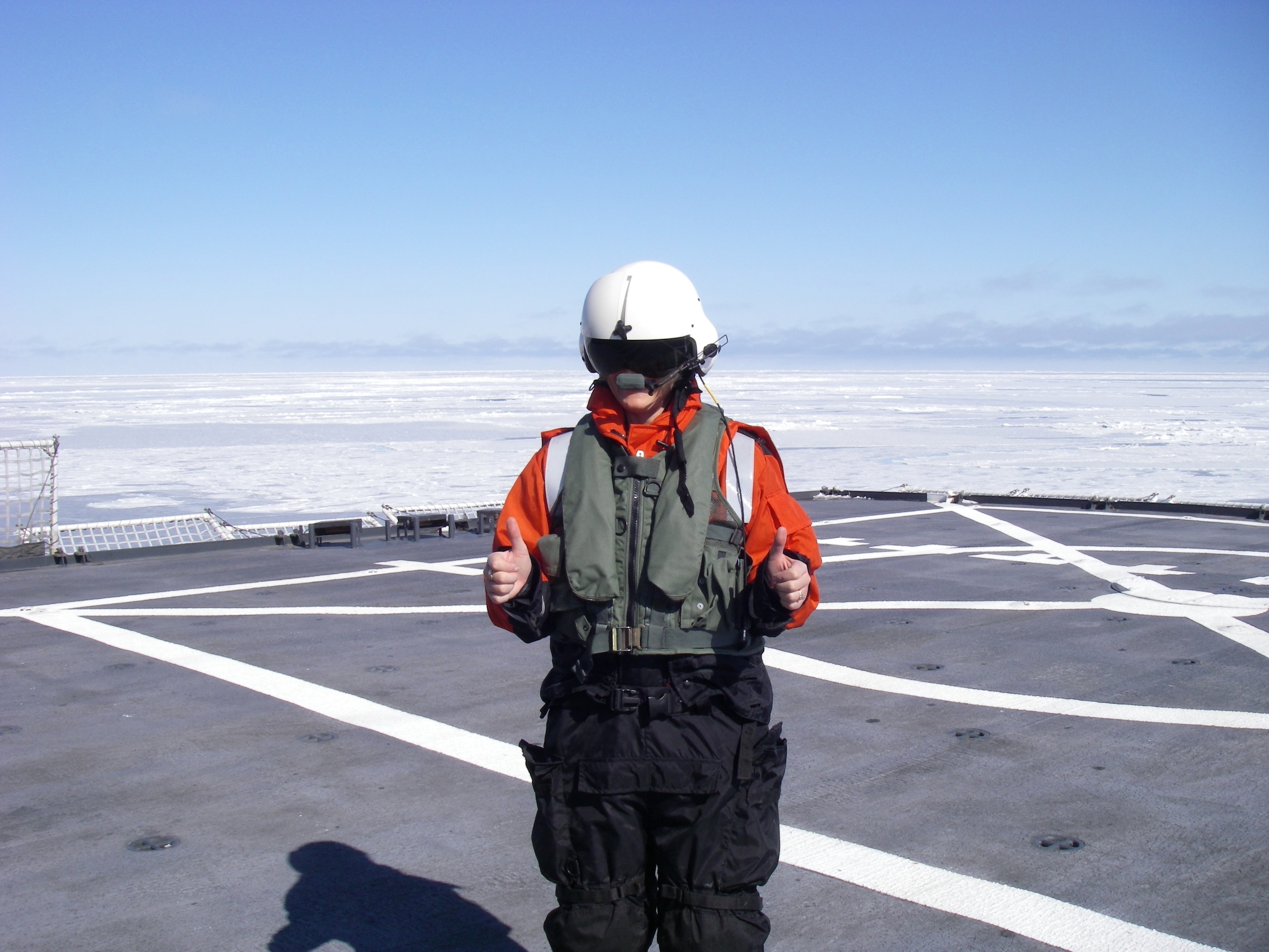 Thumbs up for the helicopter ride. On the deck of the USCGC Healy icebreaker, on the Bering Sea.