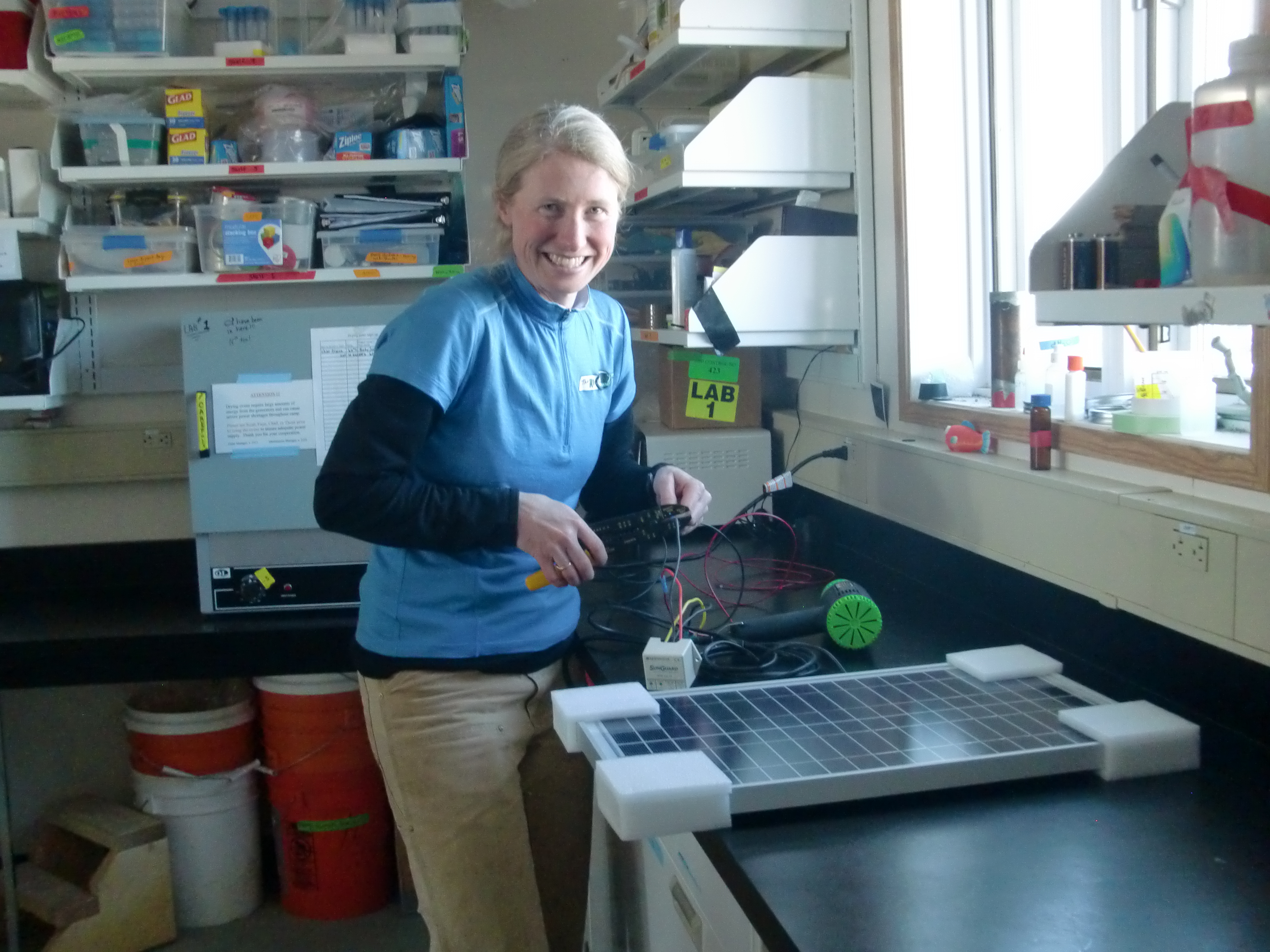 Melissa Barker wires up the solar panel to connect to the battery. Toolik Field Station, Alaska.