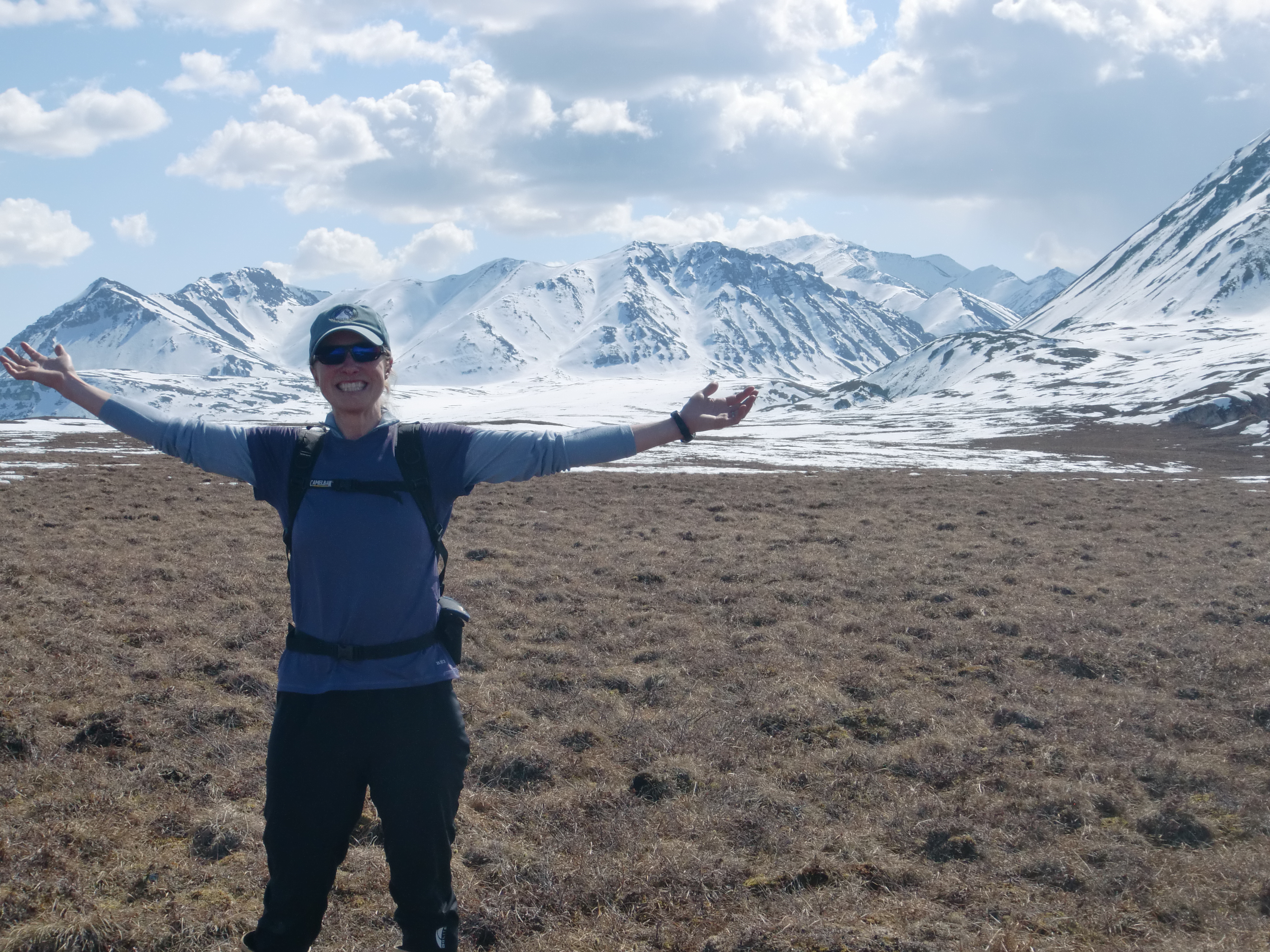 Melissa Barker in front of the Brooks Range near the Galbreith Lake aufeis. Galbraith Lake, Alaska.