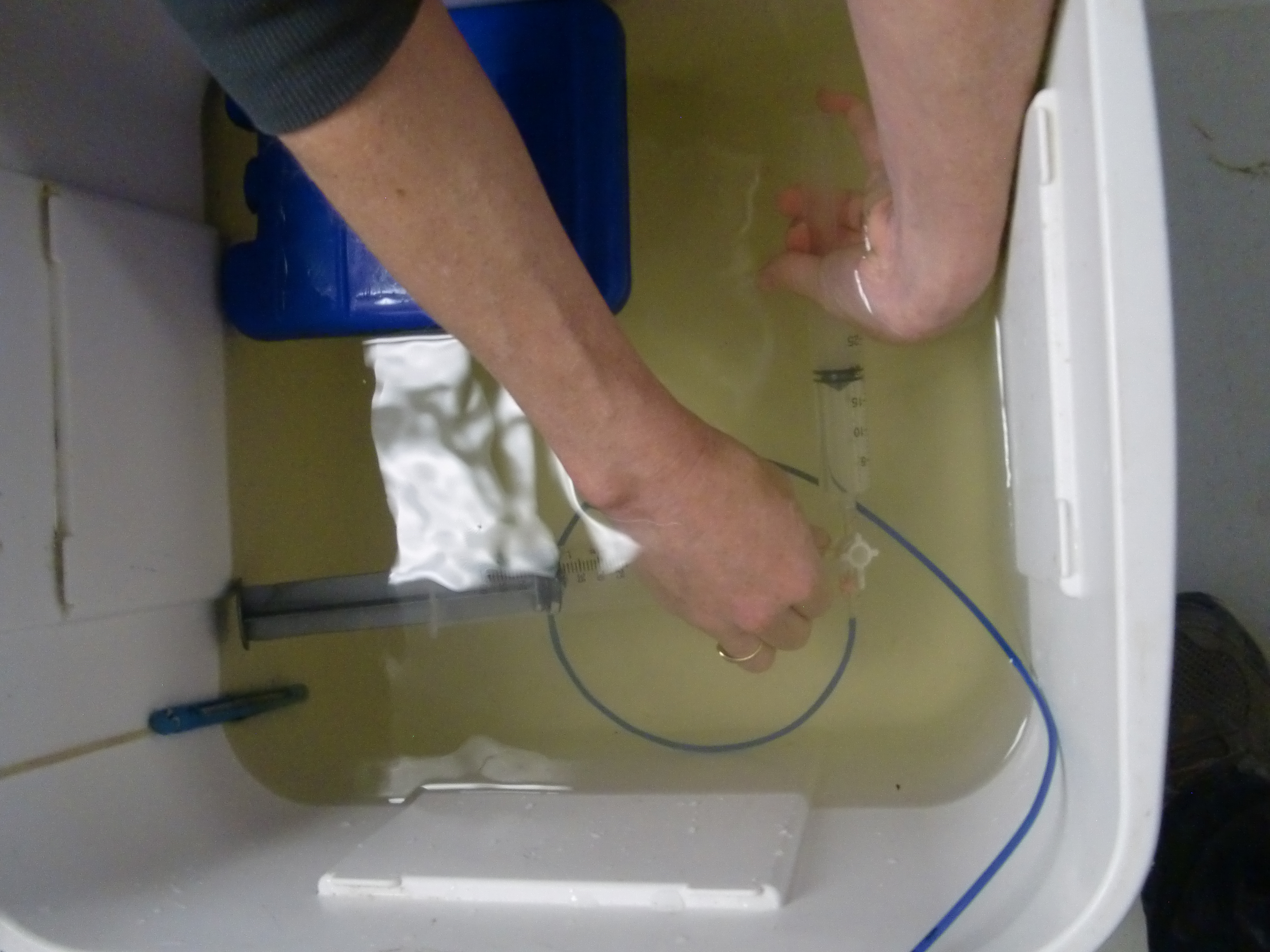 After flushing the helium syringe, Melissa attaches the water sample syringe and pushes in the helium. Toolik Field Station, Alaska.