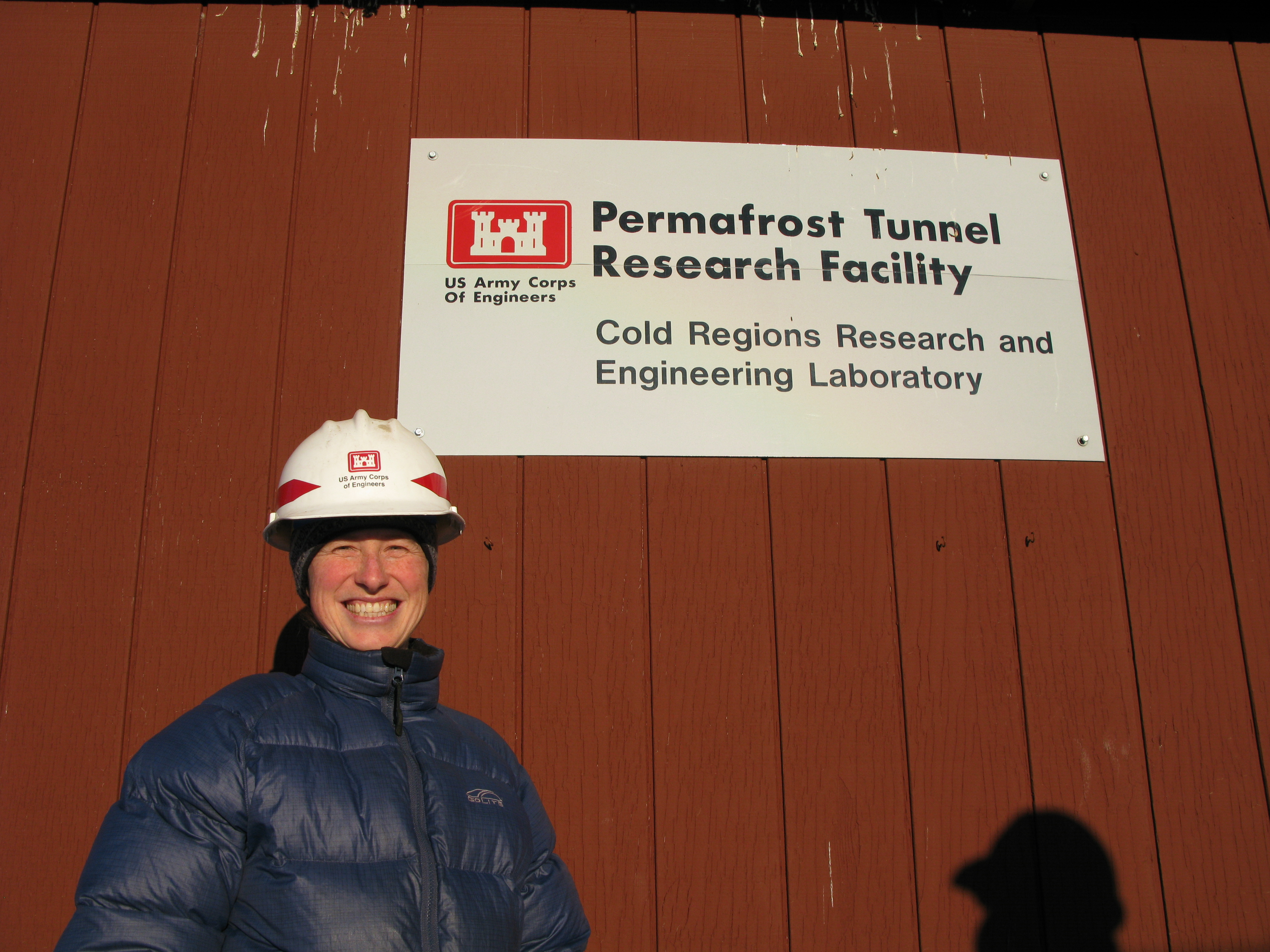 Melissa Barker in front of the Permafrost Tunnel sign. At the CRREL Permafrost Tunnel in Fox, Alaska.