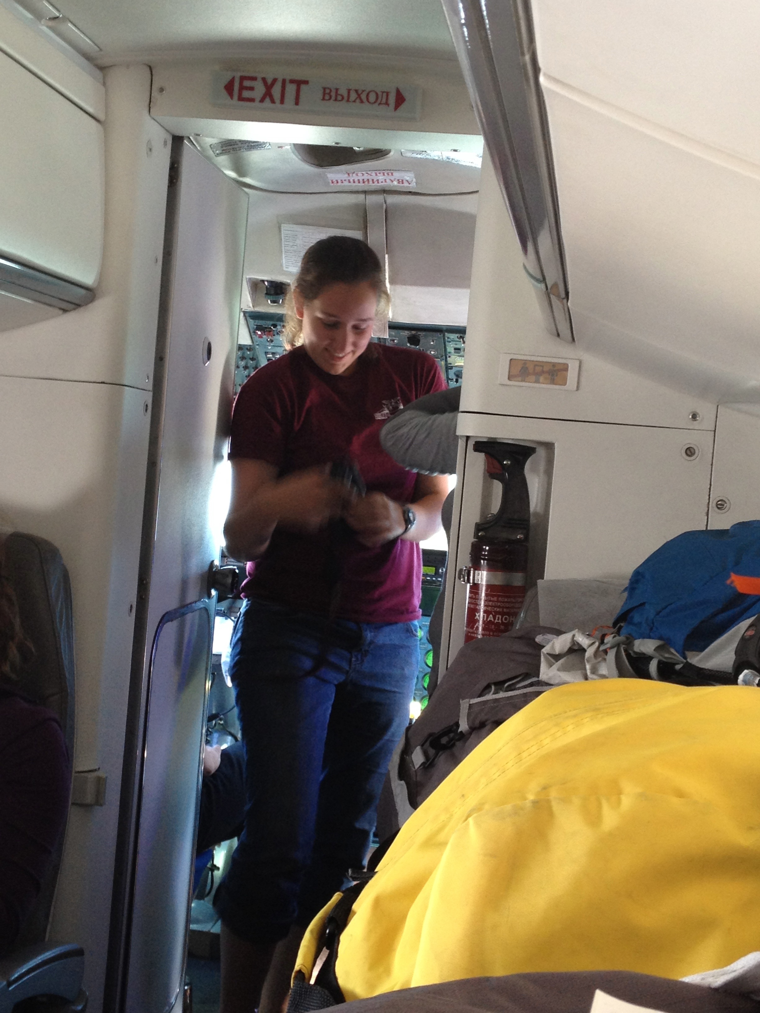 Lindsey Parkinson (Western Washington University) exits the cockpit. On the flight to Cherskiy, Russia.