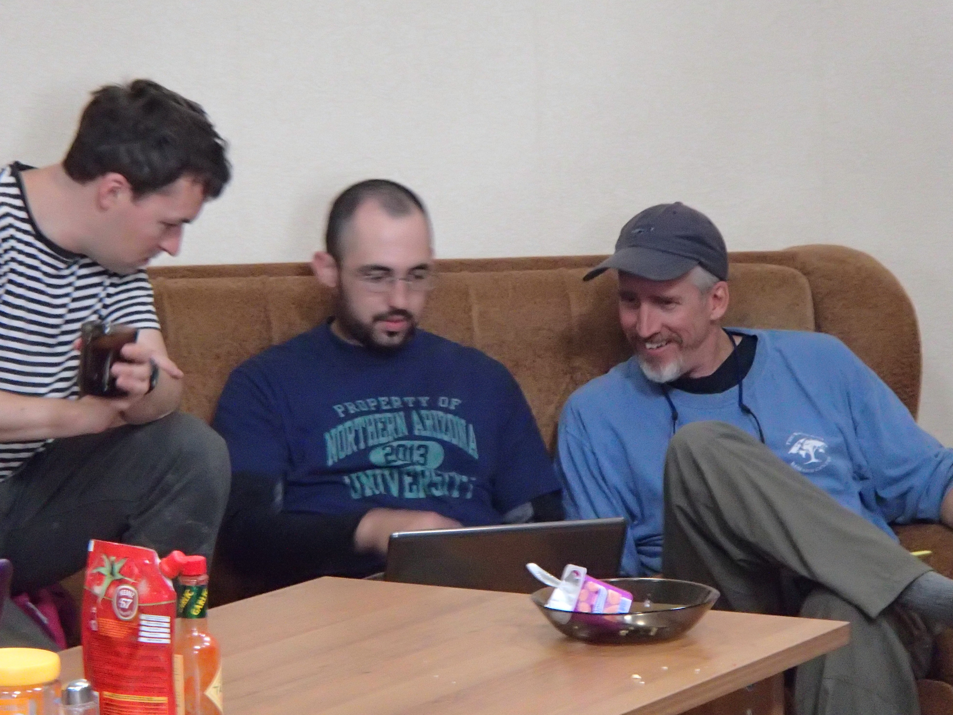 Paul Mann (left) and Max Holmes (right) take a look at Alfonso Dominguez’s (Northern Arizona University) data during a mentoring session. The Polaris Project researchers take an interest in both the science and the future of the students. Cherskiy, Russia.