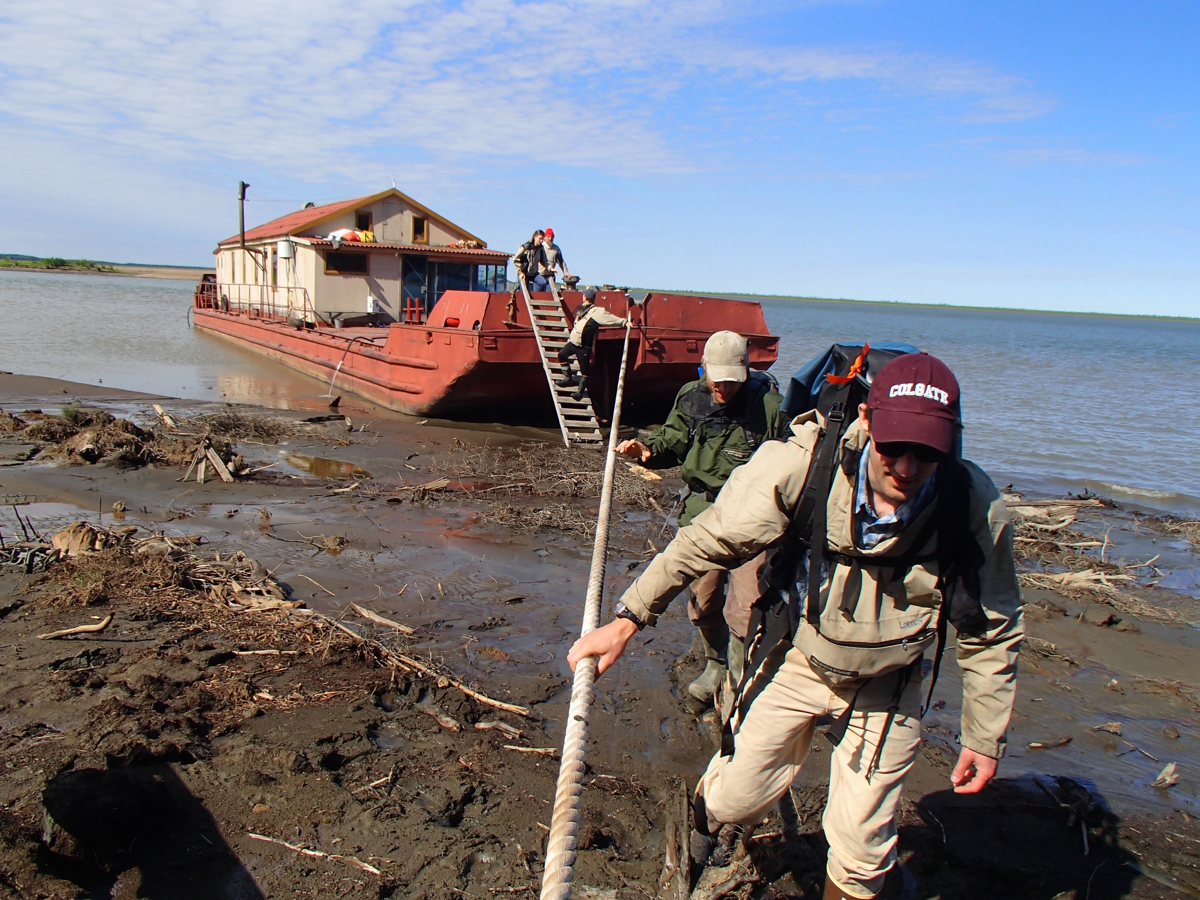 Dr. Mike Loranty (Colgate College) and Logan Berner(Woods Hole Research Institute) reach shore across a path of logs from the barge. Duvanny Yar, Russia.