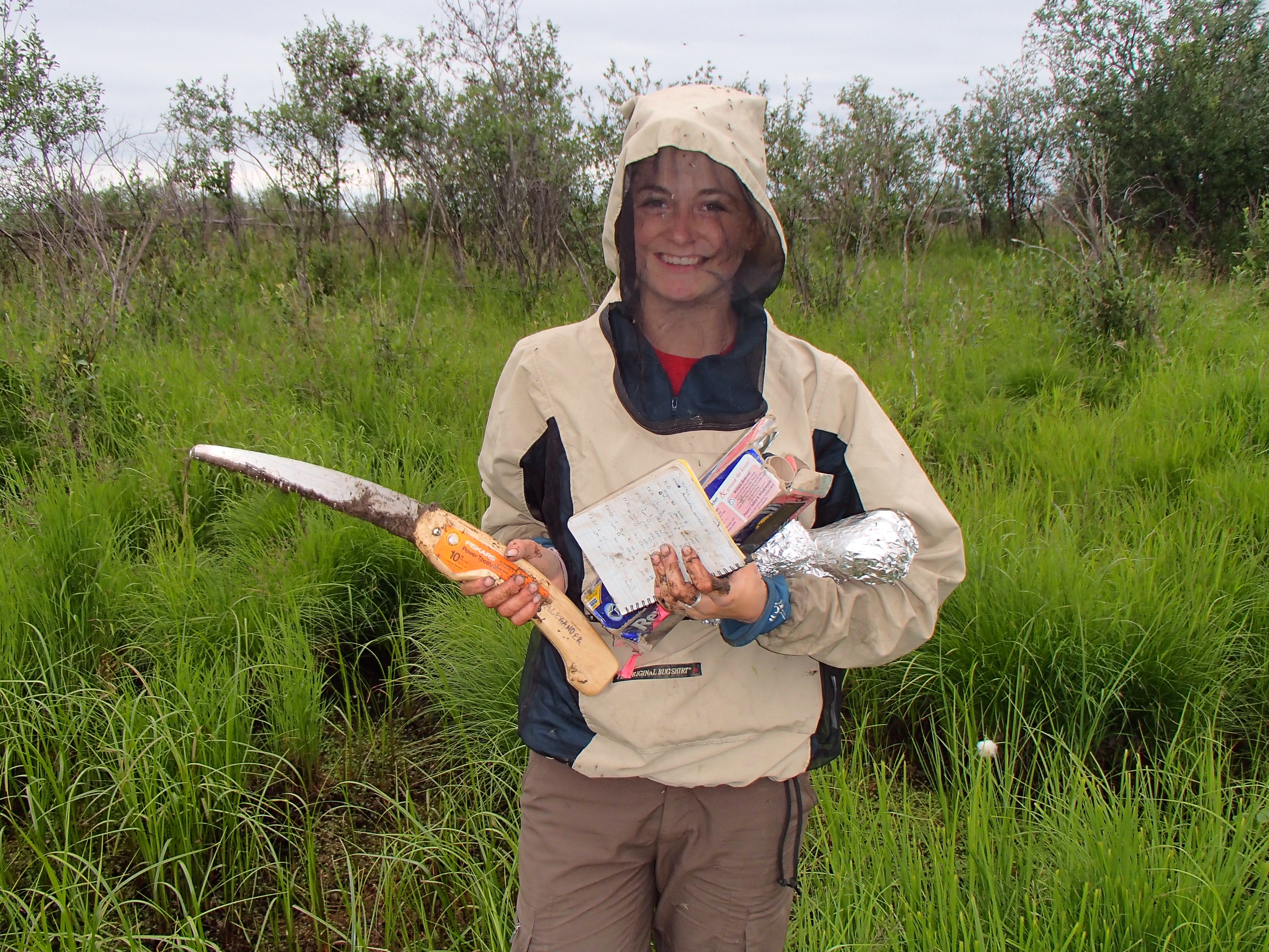 Polaris Project student Dylan Broderick (Clark University) returns from soil sampling with her soil saw, field notebook, and newest soil samples. At Pleistocene Park, south of Cherskiy, Russia.