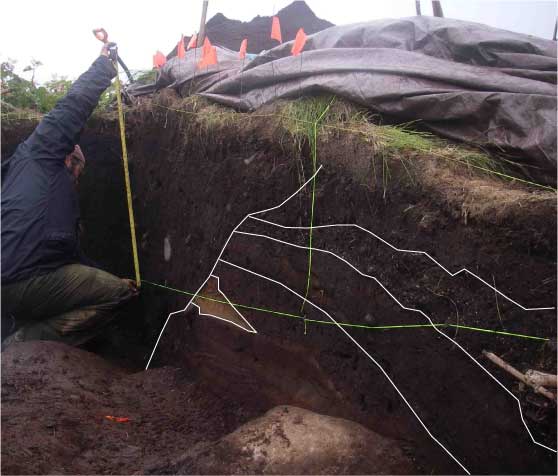 Highlights indicating some of the major stratigraphic breaks identified by Andy Ritchie in the deposits from Test Pit 1 on Rasshua Island. Rasshua Island, Kuril Islands, Russia.