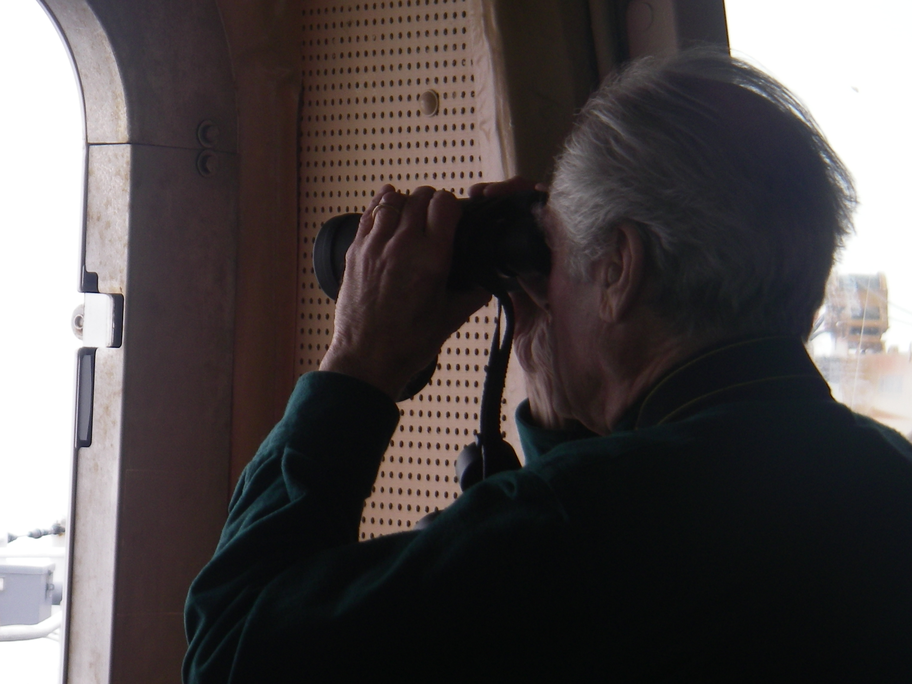 Carleton Ray looks in the direction of the walrus herd using his binoculars. On the bridge of the USCGC Healy icebreaker, on the Bering Sea.