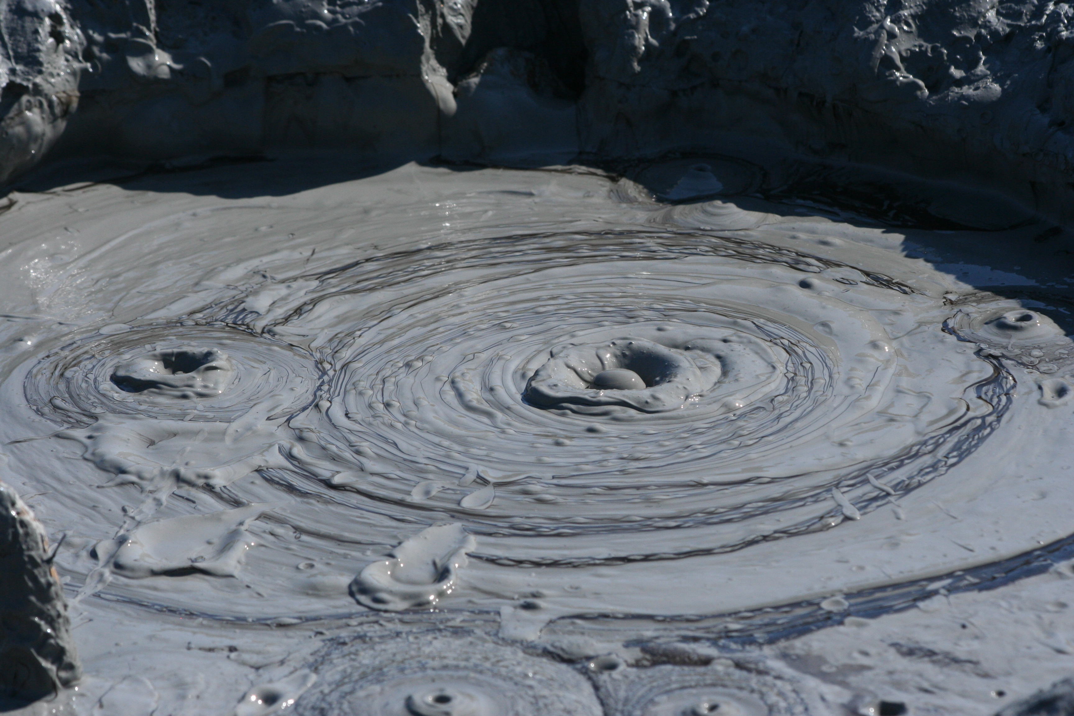 Two streams of bubbles send cold mud splatting across a "mud volcano." The "crater" of this mudpot is about 40 cm (15 inches) across. Sinegorsk, Sakhalin Island, Russia.