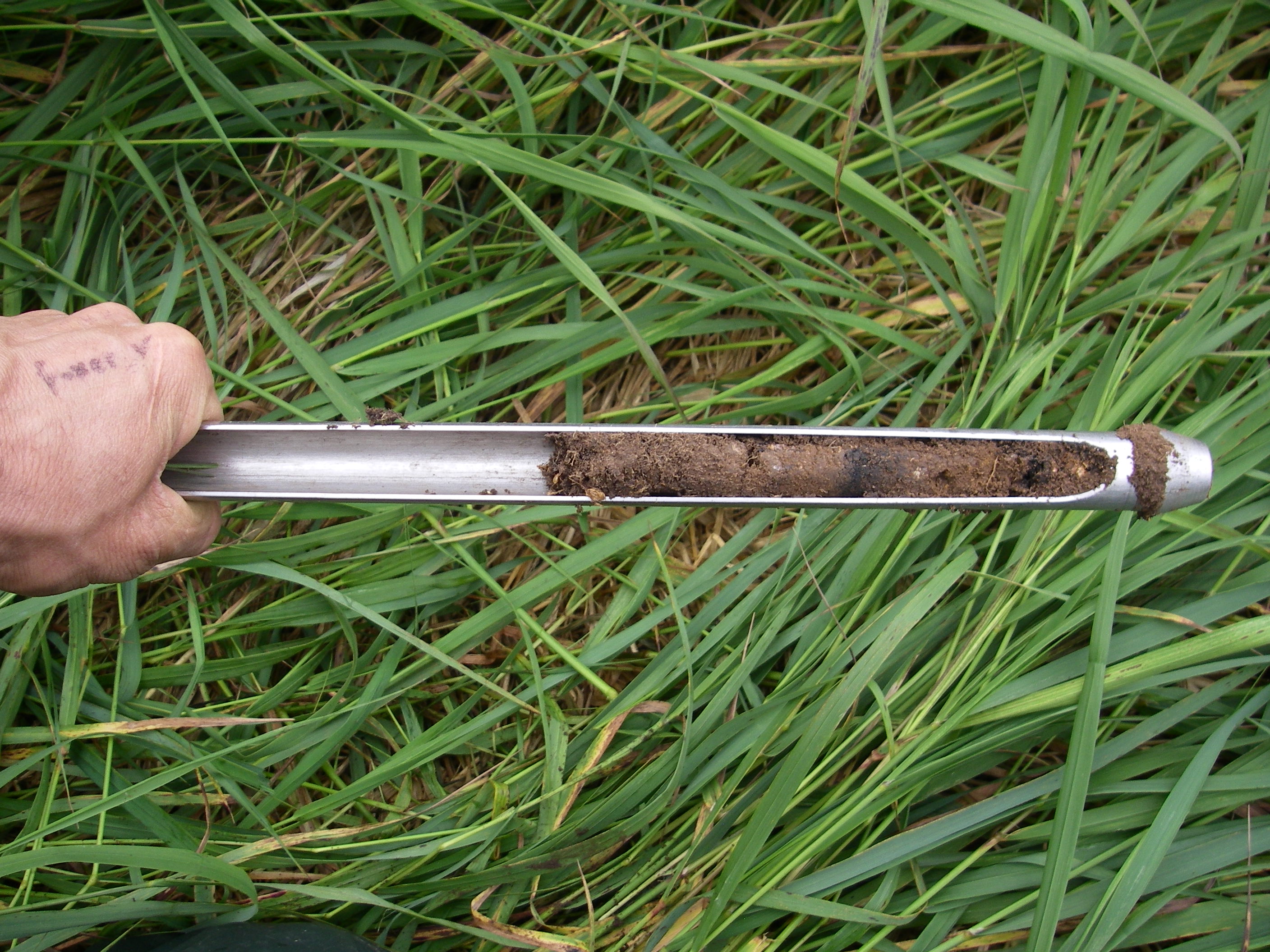Dr. Etnier examines the soil probe that has hit two layers of charcoal (identified by the black in the center and on the right-hand side of the sediment plug). This particular probe sample also has some small pieces of bone in it (the white spots). Makanrushi Island, Kuril Islands, Russia.