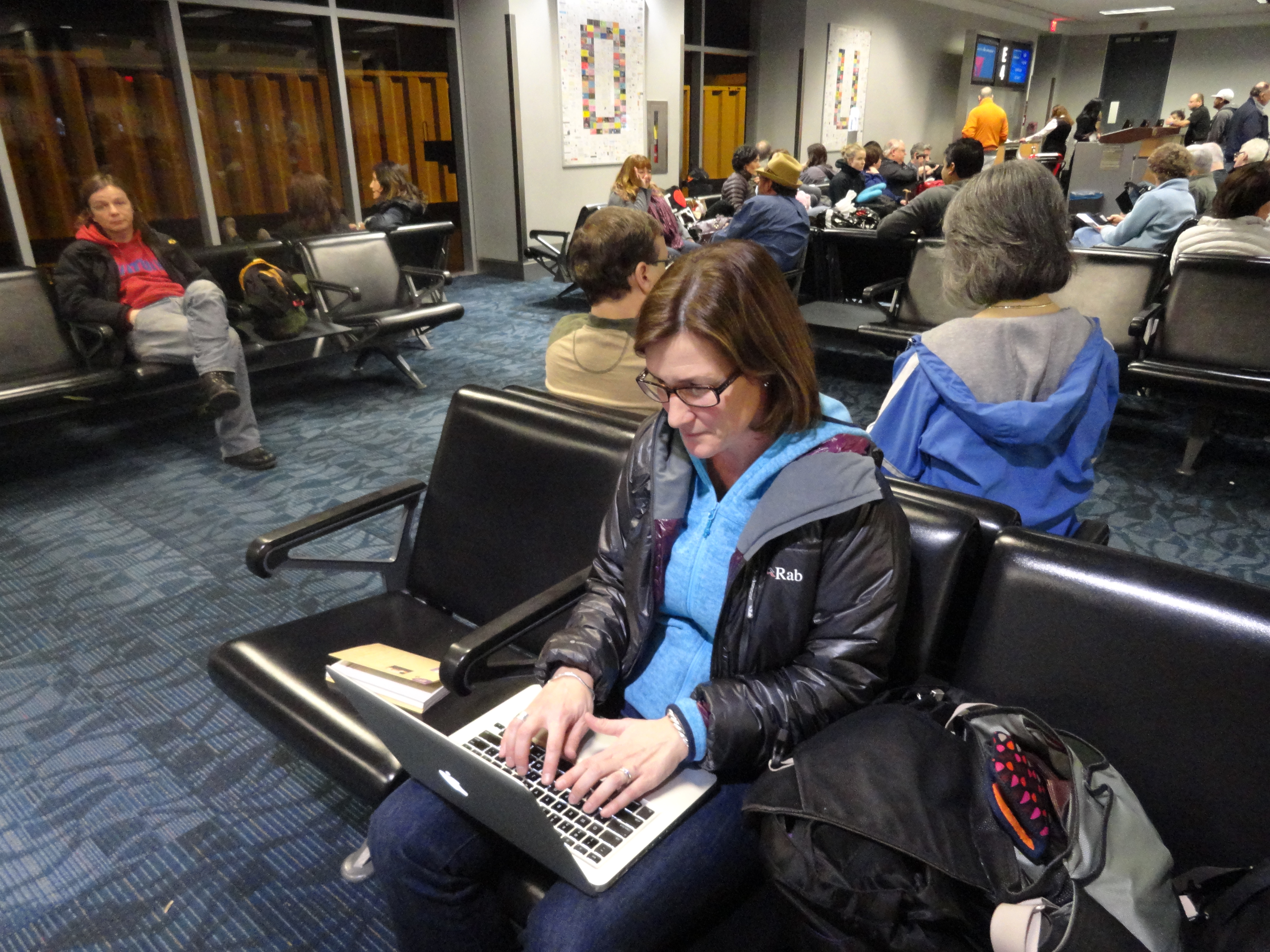 Nell Herrmann works on her PolarTREC photo journals while waiting for her flight. Hartsfield-Jackson Atlanta International Airport, Atlanta, Georgia.