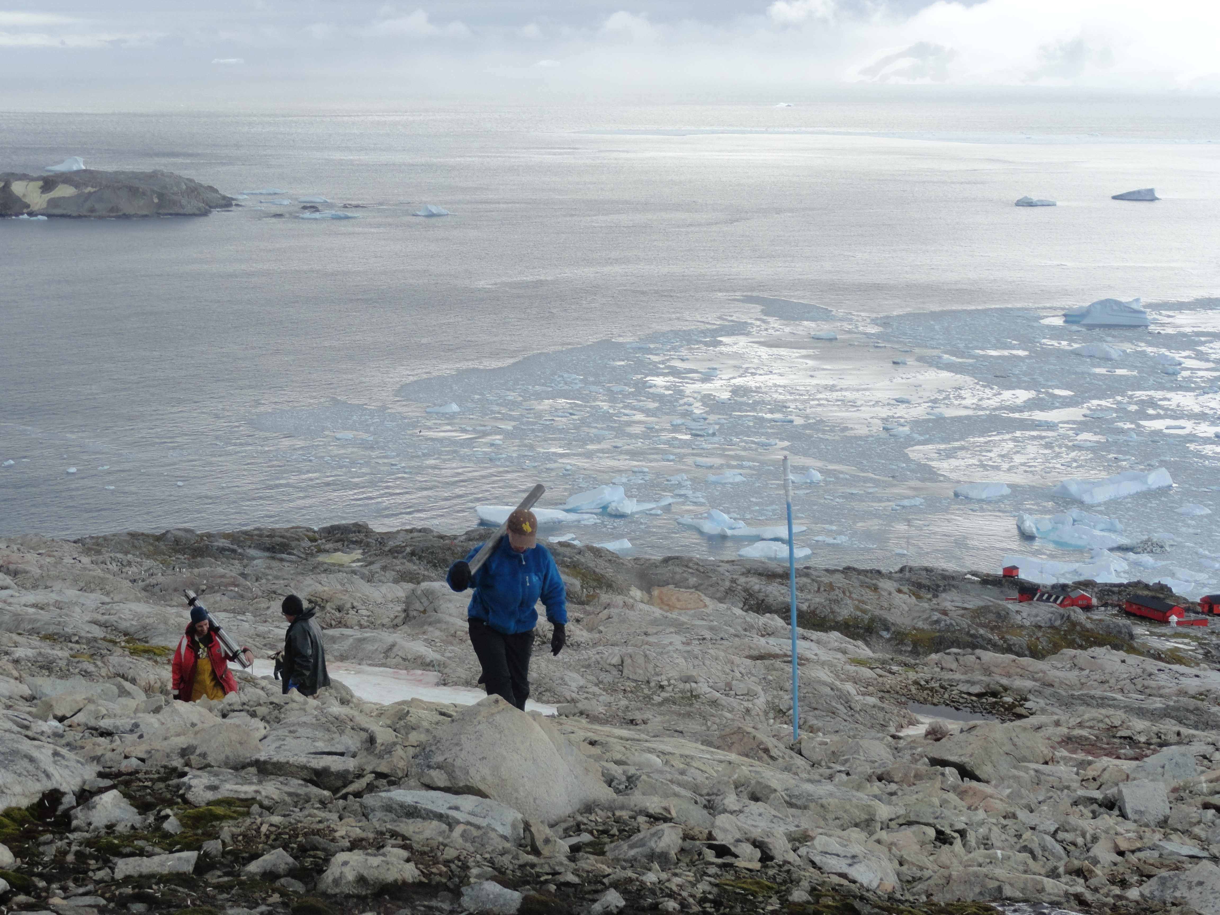 Donna Fraser carries drilling equipment for the geology team. Cierva Point, Antarctica.