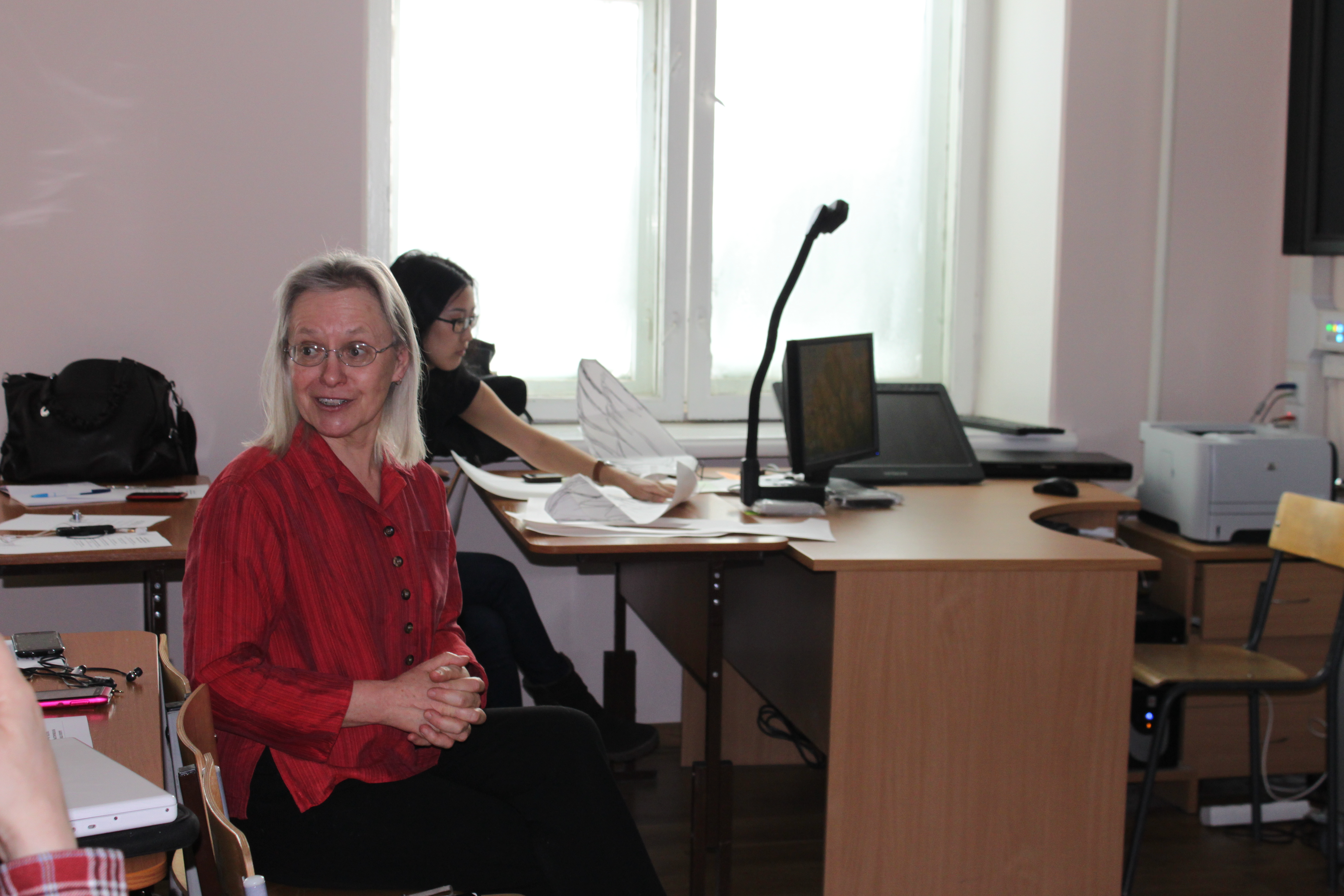 Kathleen Osgood watches the students' video. North Eastern Federal University in Yakutsk, Russia. North-Eastern Federal University in Yakutsk, Russia.