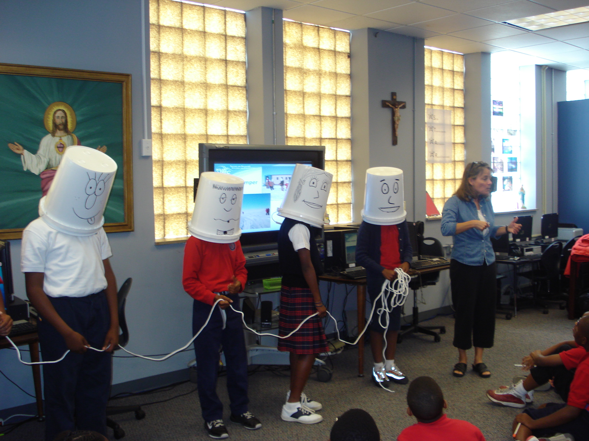 Alex Eilers and students participate in an Antarctic training activity called 'Bucket Heads' which simulate whiteout conditions in Antarctica. At St. John Catholic School in Memphis, Tennessee.