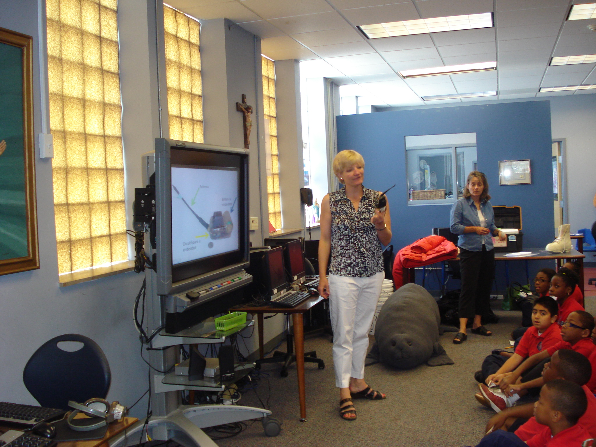 Dr. Jennifer Burns describes to the students the satellite tags that are placed on Weddell seals. At St. John Catholic School in Memphis, Tennessee.