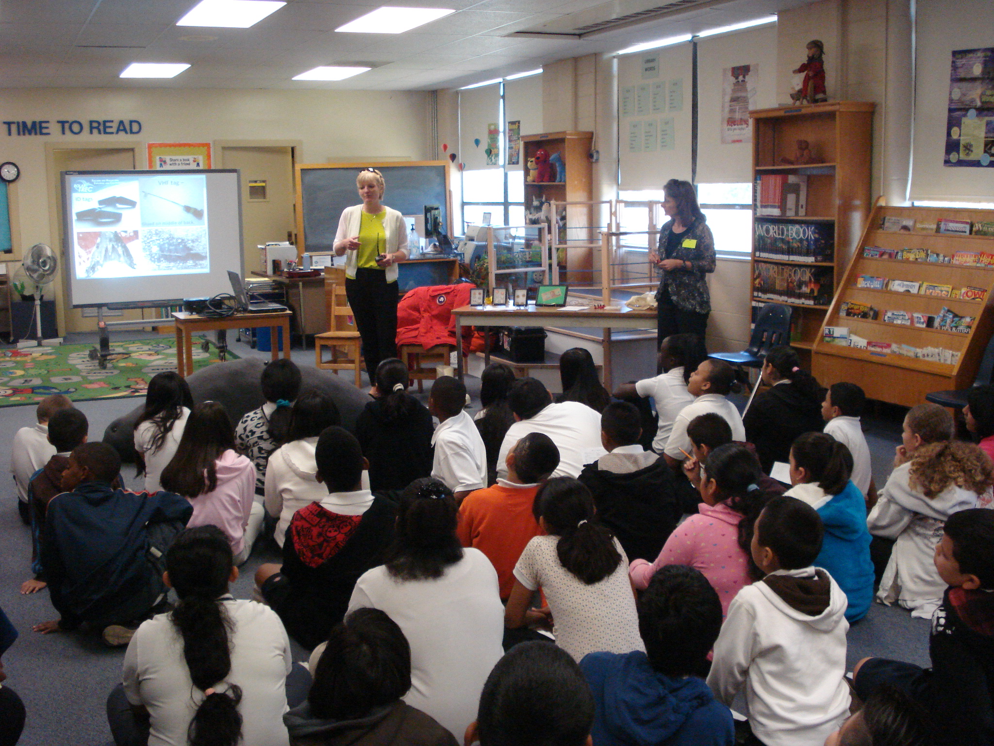 Dr. Jennifer Burns shows students the tags they use to tag Weddell seals. At Jackson Elementary School in Memphis, Tennessee.