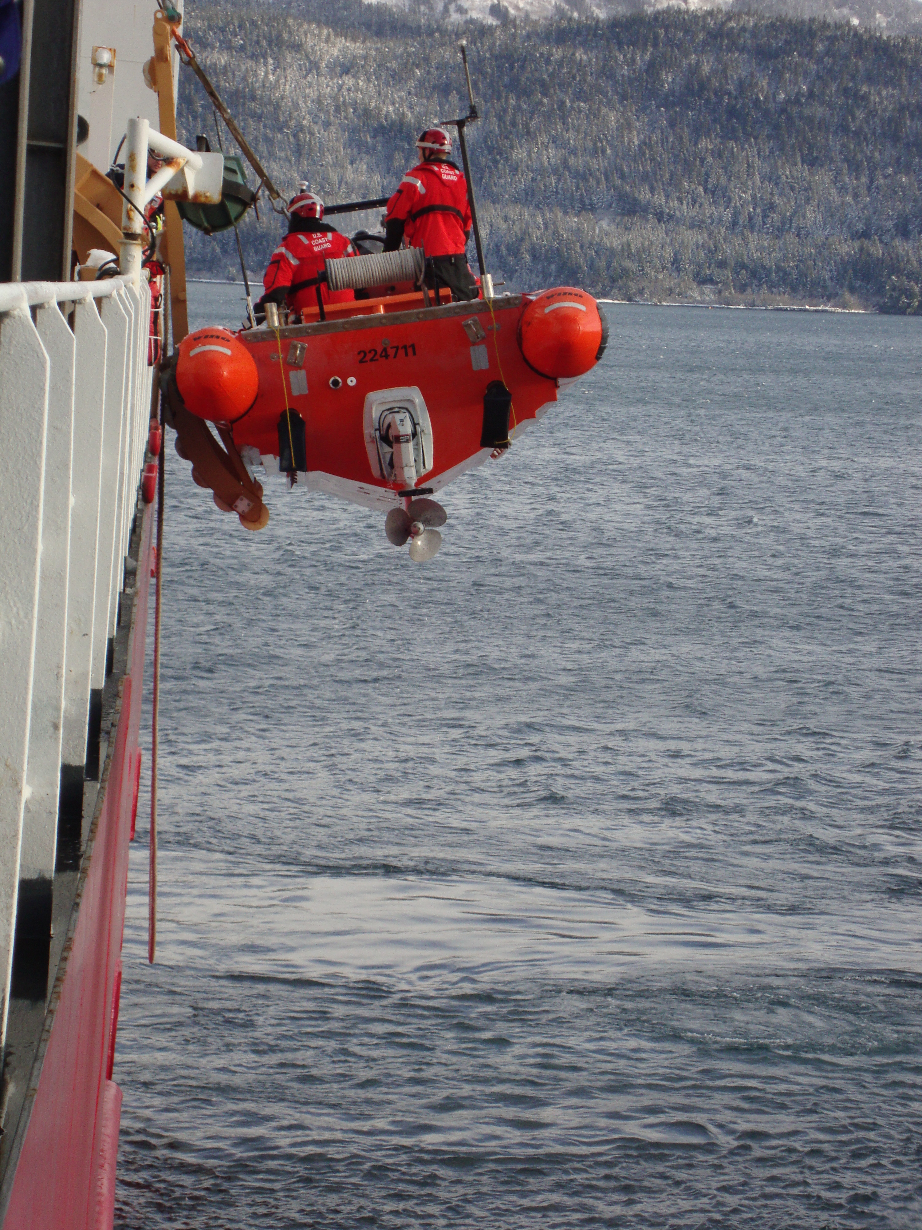 A boat is returned to the Healy. Aboard the USCGC Healy icebreaker.