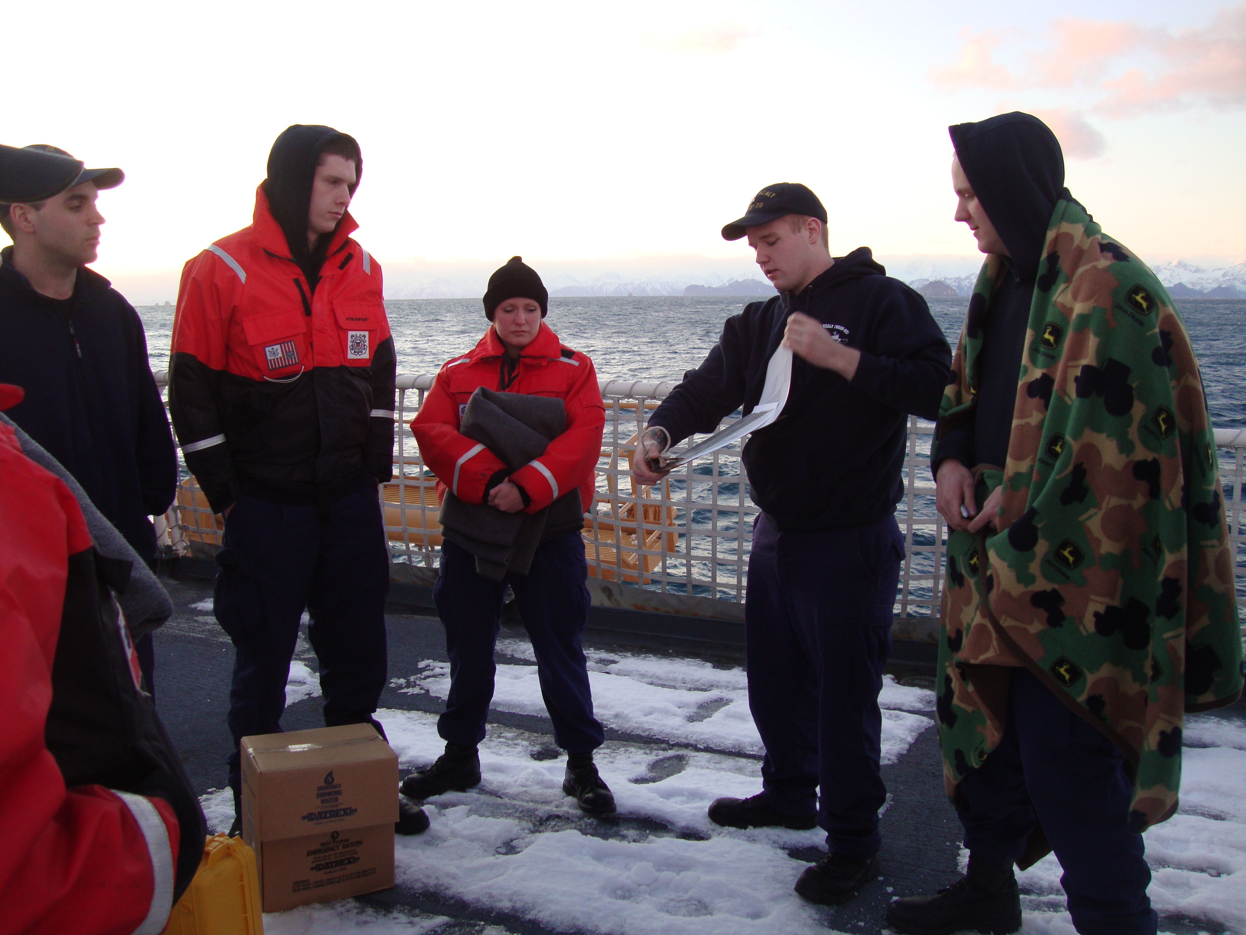 Chantelle Rose and other team and crew listen to the abandon ship drill directions. Aboard the USCGC Healy icebreaker on the flight deck.