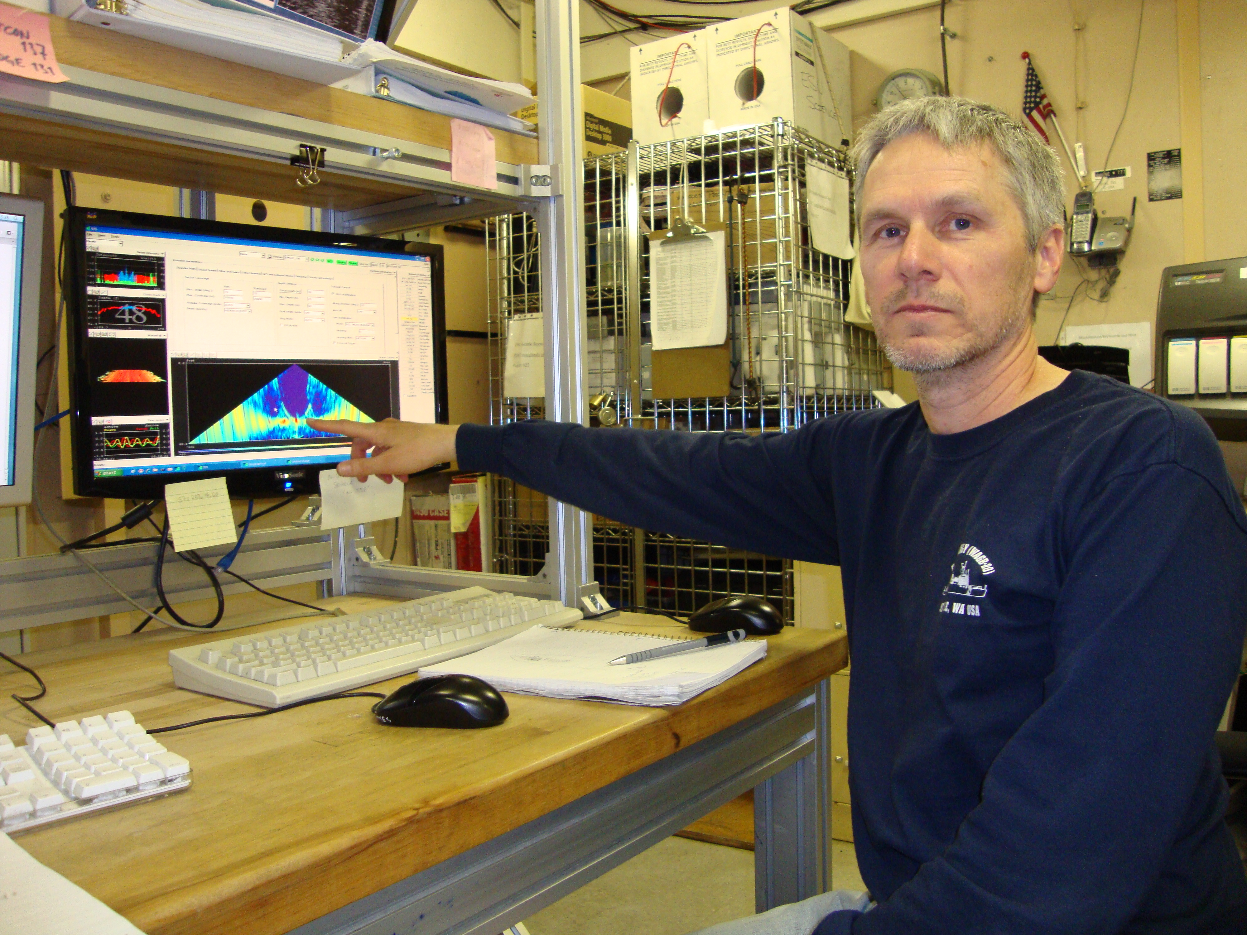 Steve Roberts shows Chantelle Rose the sonar. Aboard the USCGC Healy icebreaker computer lab.