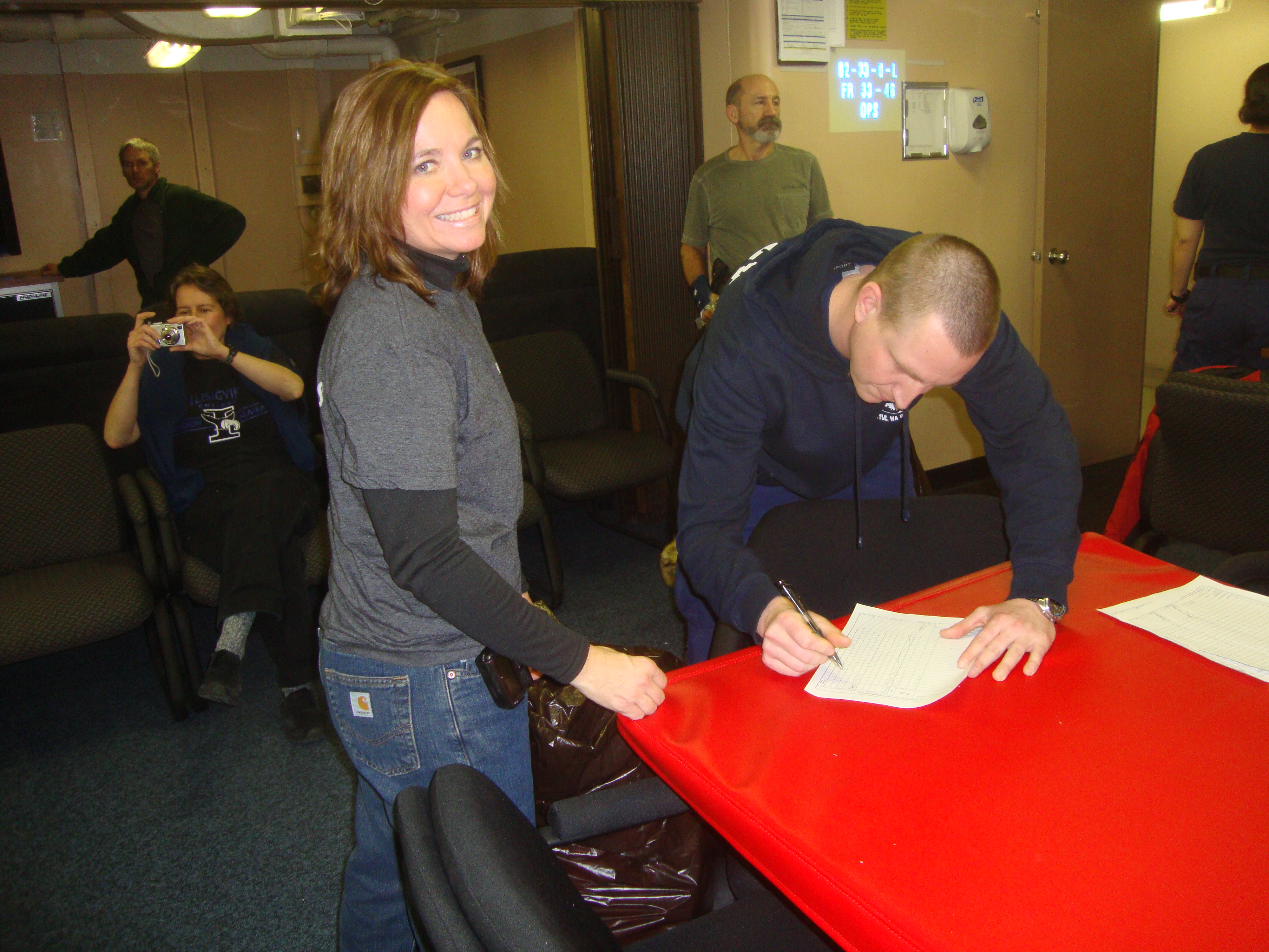 Chantelle Rose turns in her arctic gear. Aboard the USCGC Healy icebreaker in the science conference lounge.