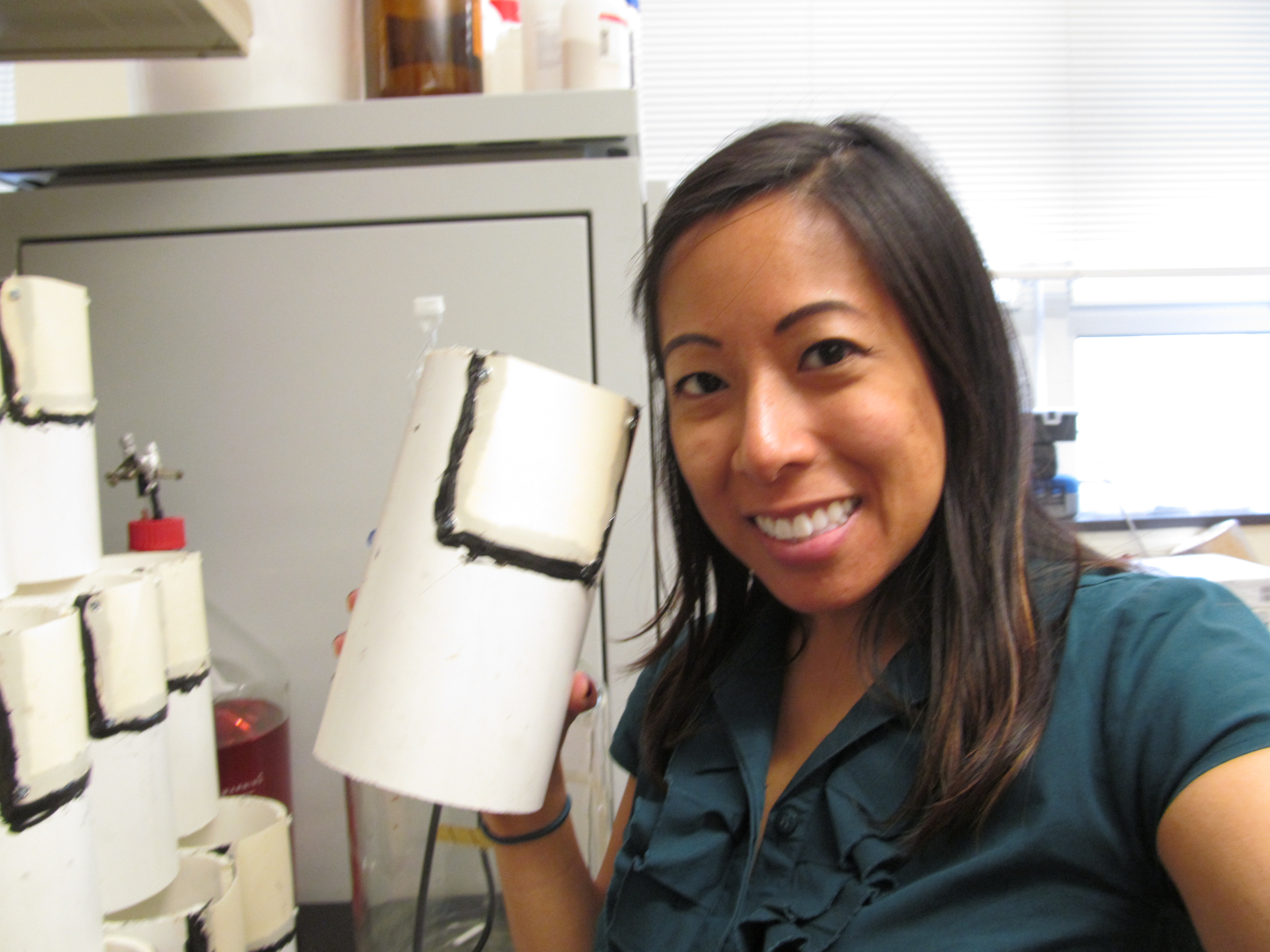 Cristina Solis poses with a soil chamber. The soil chambers have a membrane which allow for ions to move back and forth. Ithaca, New York.
